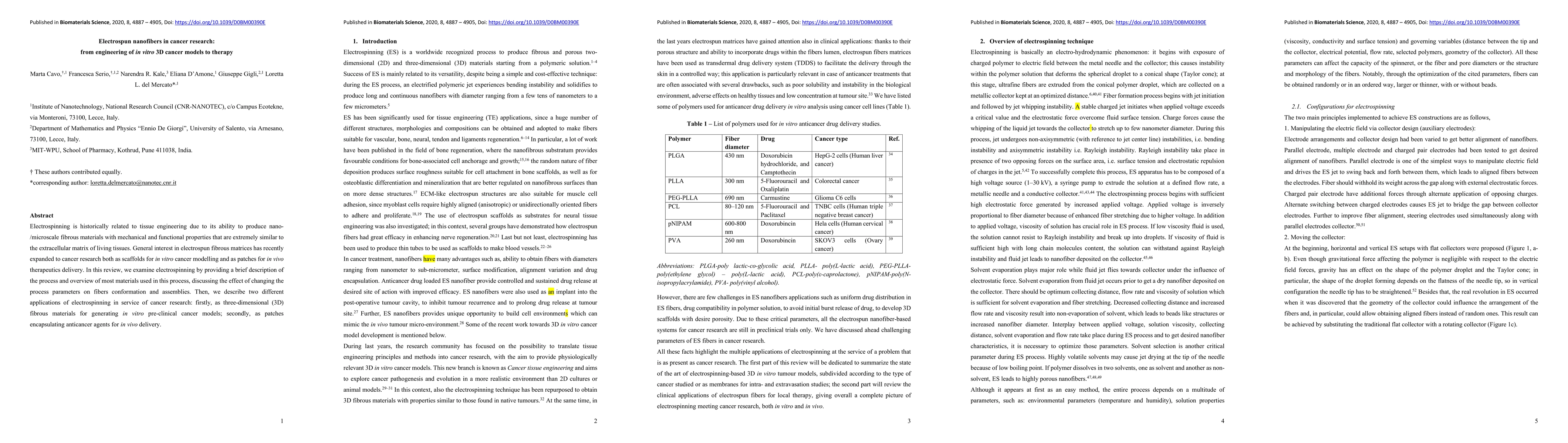 Electrospinning is historically related to tissue engineering due to its ability to produce nano-/microscale fibrous materials with mechanical and functional properties that are extremely similar to those of the extracellular matrix of living tissues. The general interest in electrospun fibrous matrices has recently expanded to cancer research both as scaffolds for in vitro cancer modelling and as patches for in vivo therapeutic delivery. In this review, we examine electrospinning by providing a brief description of the process and overview of most materials used in this process, discussing the effect of changing the process parameters on fiber conformations and assemblies. Then, we describe two different applications of electrospinning in service of cancer research: firstly, as three-dimensional (3D) fibrous materials for generating in vitro pre-clinical cancer models; and secondly, as patches encapsulating anticancer agents for in vivo delivery.