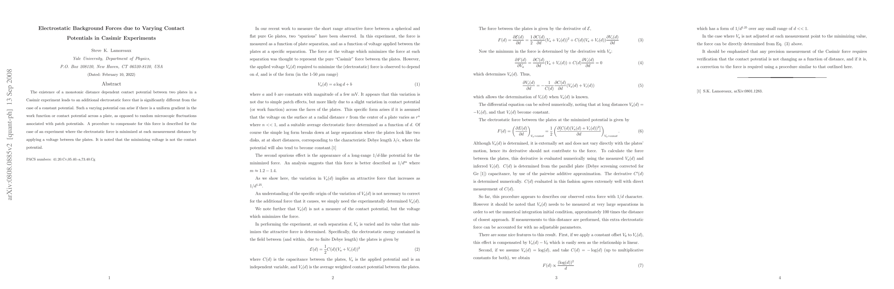 The existence of a monotonic distance dependent contact potential between two plates in a Casimir experiment leads to an additional electrostatic force that is significantly different from the case of a constant potential. Such a varying potential can arise if there is a uniform gradient in the work function or contact potential across a plate, as opposed to random microscopic fluctuations associated with patch potentials. A procedure to compensate for this force is described for the case of an experiment where the electrostatic force is minimized at each measurement distance by applying a voltage between the plates. It is noted that the minimizing voltage is not the contact potential.