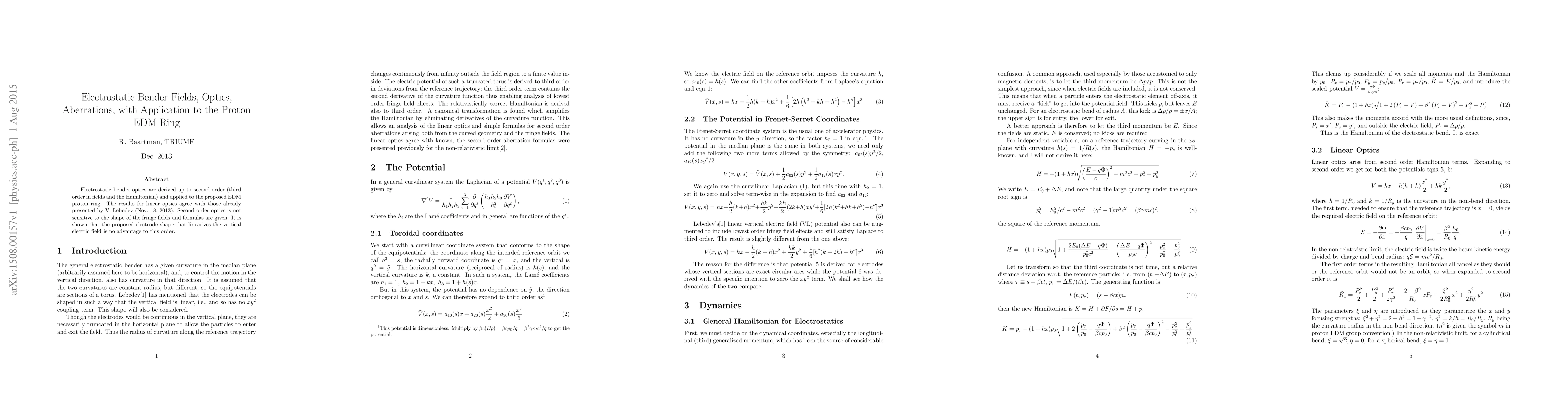 Electrostatic bender optics are derived up to second order (third order in fields and the Hamiltonian) and applied to the proposed EDM proton ring. The results for linear optics agree with those already presented by V.\ Lebedev (Nov.\ 18, 2013). Second order optics is not sensitive to the shape of the fringe fields and formulas are given. It is shown that the proposed electrode shape that linearizes the vertical electric field is no advantage to this order.