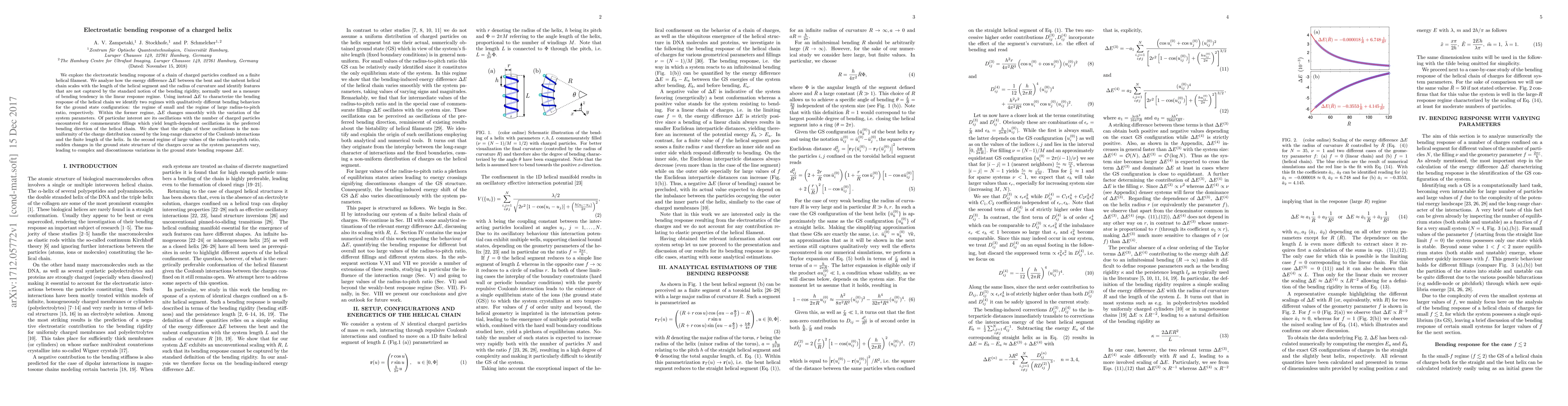 We explore the electrostatic bending response of a chain of charged particles confined on a finite helical filament. We analyze how the energy difference $\Delta E$ between the bent and the unbent helical chain scales with the length of the helical segment and the radius of curvature and identify features that are not captured by the standard notion of the bending rigidity, normally used as a measure of bending tendency in the linear response regime. Using instead $\Delta E$ to characterize the bending response of the helical chain we identify two regimes with qualitatively different bending behaviors for the ground state configuration: the regime of small and the regime of large radius-to-pitch ratio, respectively. Within the former regime, $\Delta E$ changes smoothly with the variation of the system parameters. Of particular interest are its oscillations with the number of charged particles encountered for commensurate fillings which yield length-dependent oscillations in the preferred bending direction of the helical chain. We show that the origin of these oscillations is the non-uniformity of the charge distribution caused by the long-range character of the Coulomb interactions and the finite length of the helix. In the second regime of large values of the radius-to-pitch ratio, sudden changes in the ground state structure of the charges occur as the system parameters vary, leading to complex and discontinuous variations in the ground state bending response $\Delta E$.