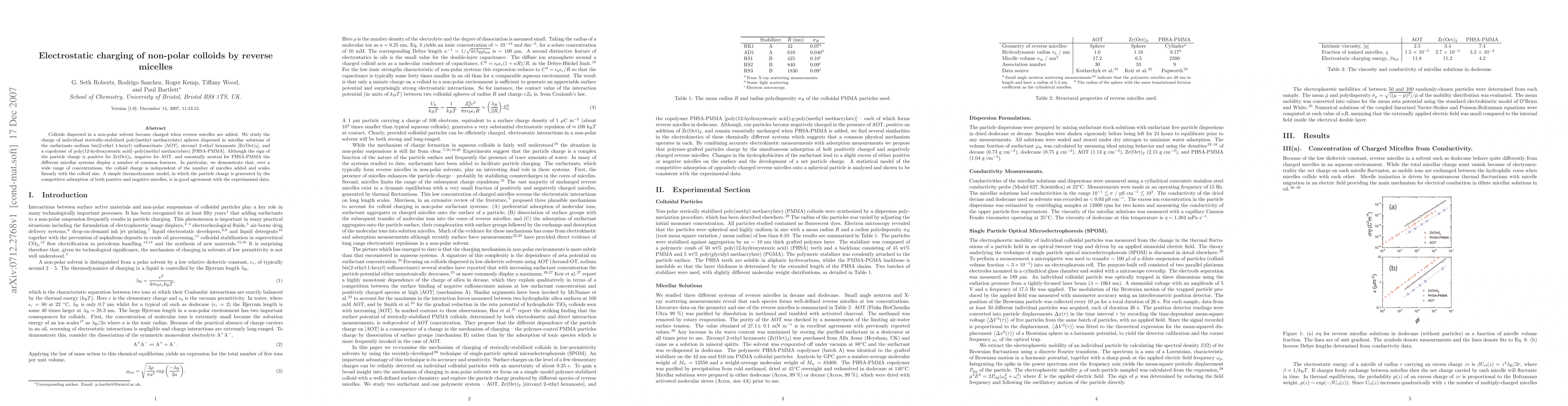 This paper investigates the electrostatic charging of non-polar colloids by reverse micelles in various surfactant solutions, finding that colloid charge scales linearly with size and is independent of micelle concentration. A thermodynamic model explaining the competitive adsorption of micelles aligns well with experimental observations.