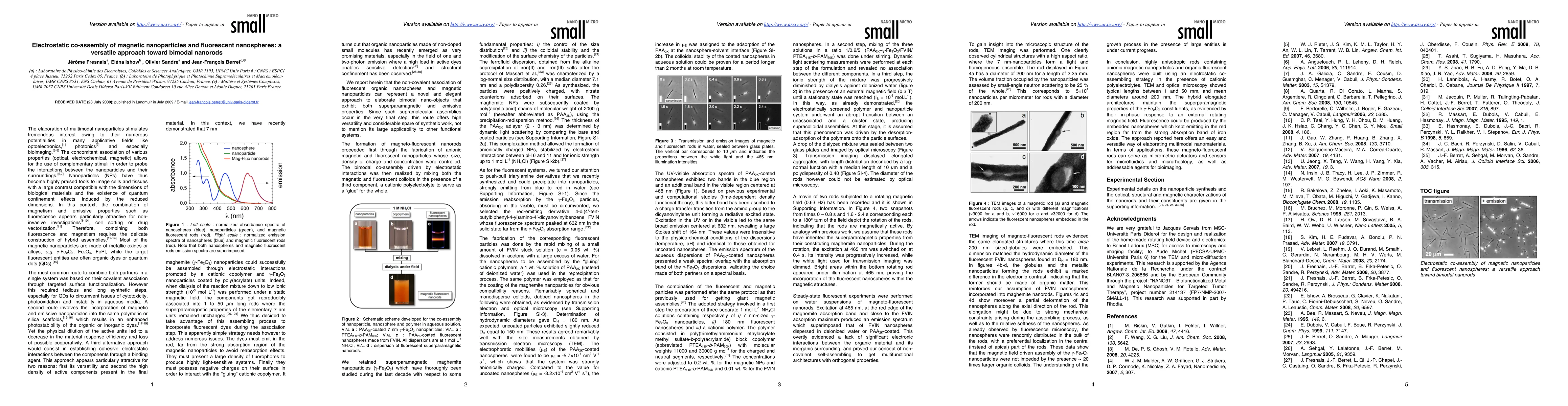 The elaboration of multimodal nanoparticles stimulates tremendous interest owing to their numerous potentialities in many applicative fields like optoelectronics, photonics and especially bioimaging. The concomitant association of various properties (optical, electrochemical, magnetic) allows for the use of complementary stimuli in order to probe the interactions between the nanoparticles and their surroundings.Nanoparticles (NPs) have thus become highly praised tools to image cells and tissues with a large contrast compatible with the dimensions of biological materials and the existence of quantum confinement effects induced by the reduced dimensions. In this context, the combination of magnetism and emissive properties such as fluorescence appears particularly attractive for non-invasive investigations, cell sorting or drug vectorization. Therefore, combining both fluorescence and magnetism requires the delicate construction of hybrid assemblies. Most of the magnetic nanoparticles are made of metallic oxides or alloys, e.g. gamma-Fe2O3, Fe3O4, FePt, while the target fluorescent entities are often organic dyes or quantum dots (QDs).