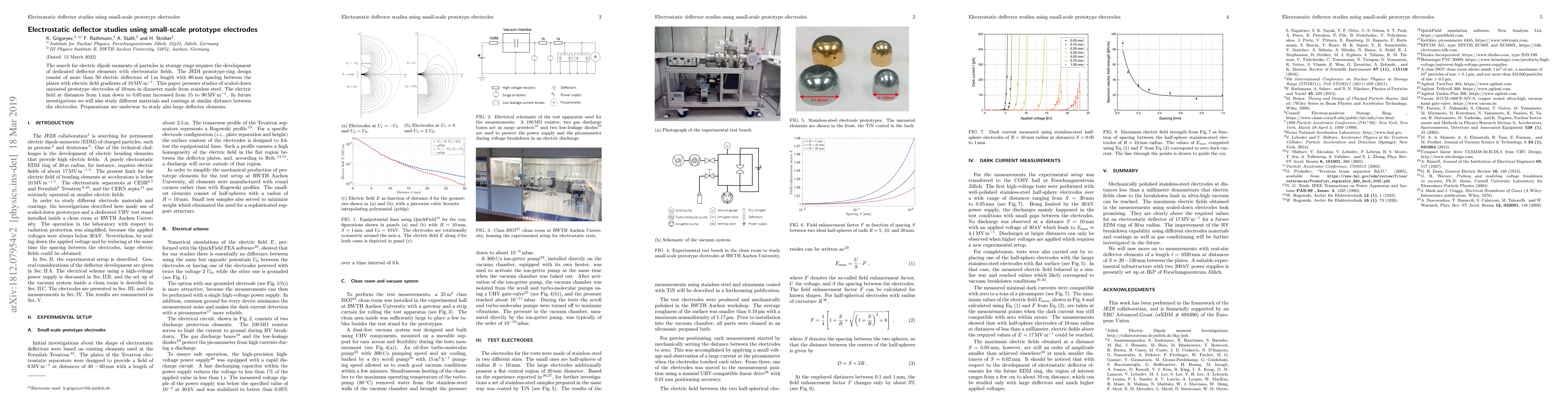 The search for electric dipole moments of particles in storage rings requires the development of dedicated deflector elements with electrostatic fields. In these rings, electric deflectors shall be used as bending elements for the charged particles. This paper presents studies on scaled-down prototypes, a few cm in size, to investigate different deflector materials at similar electric fields but much smaller distances than real size prototypes.