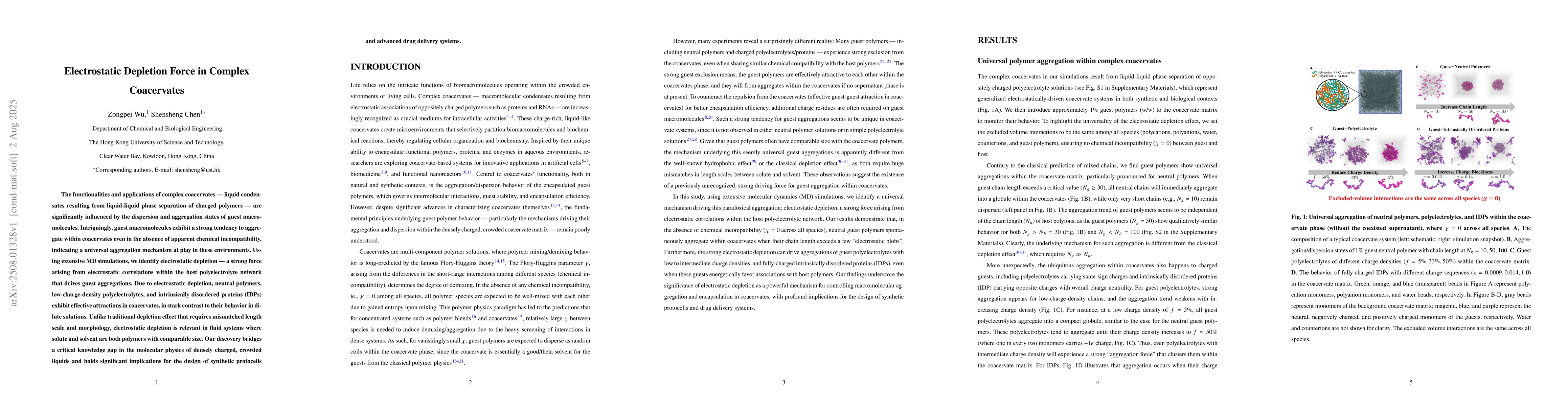 The functionalities and applications of complex coacervates -- liquid condensates resulting from liquid-liquid phase separation of charged polymers -- are significantly influenced by the dispersion and aggregation states of guest macromolecules. Intriguingly, guest macromolecules exhibit a strong tendency to aggregate within coacervates even in the absence of apparent chemical incompatibility, indicating a universal aggregation mechanism at play in these environments. Using extensive MD simulations, we identify electrostatic depletion -- a strong force arising from electrostatic correlations within the host polyelectrolyte network that drives guest aggregations. Due to electrostatic depletion, neutral polymers, low-charge-density polyelectrolytes, and intrinsically disordered proteins (IDPs) exhibit effective attractions in coacervates, in stark contrast to their behavior in dilute solutions. Unlike traditional depletion effect that requires mismatched length scale and morphology, electrostatic depletion is relevant in fluid systems where solute and solvent are both polymers with comparable size. Our discovery bridges a critical knowledge gap in the molecular physics of densely charged, crowded liquids and holds significant implications for the design of synthetic protocells and advanced drug delivery systems.