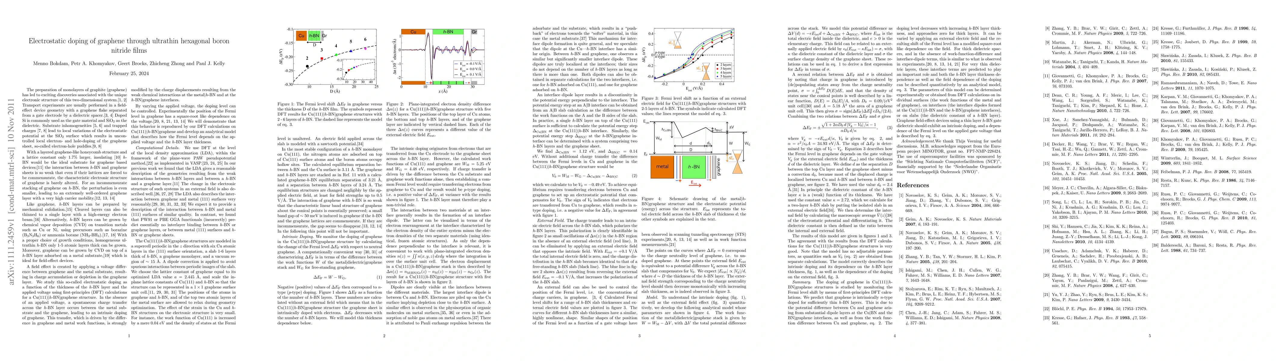 The research investigates electrostatic doping of graphene via ultrathin hexagonal boron nitride (h-BN) films using DFT calculations and an analytical model. The study reveals that intrinsic doping is particularly significant for very thin h-BN layers, dominated by interface effects evaluated from DFT, suggesting promising experimental observations.
