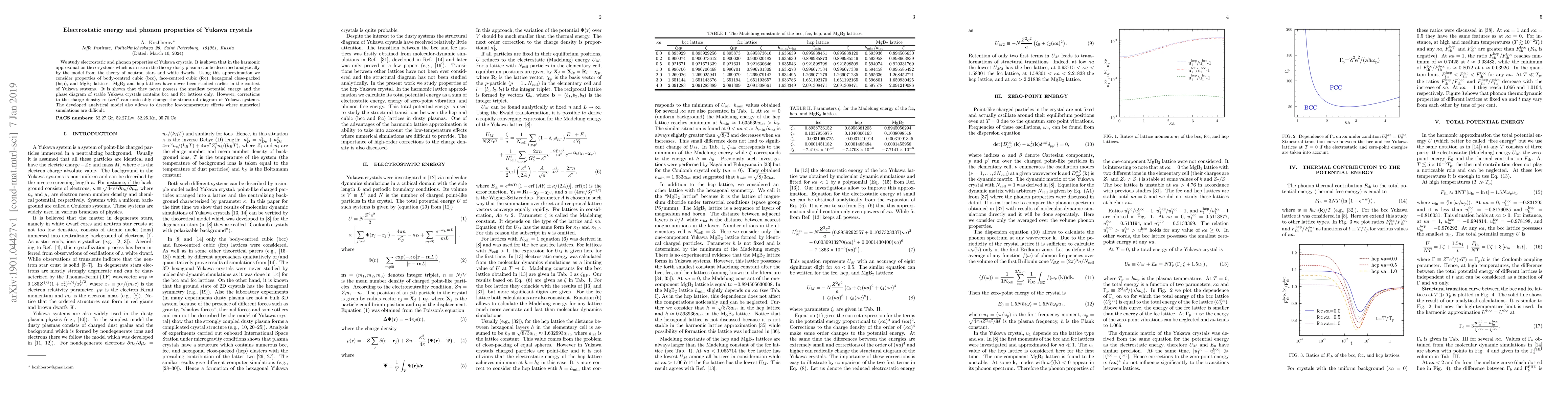 This paper analytically investigates electrostatic and phonon properties of Yukawa crystals, showing that bcc and fcc lattices are stable in the harmonic approximation, while MgB$_2$ and hcp lattices are not. Corrections to charge density can significantly alter the structural stability of these systems.