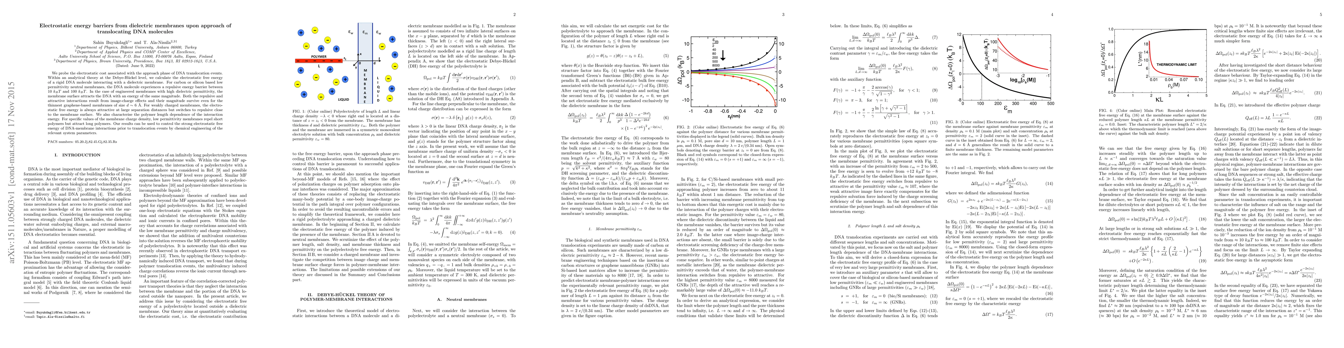 This paper investigates the electrostatic energy barriers encountered by DNA molecules approaching dielectric membranes, finding that low permittivity membranes create repulsive barriers, while high permittivity membranes attract DNA, both effects stemming from image-charge interactions. The study also reveals that polymer length influences the interaction, with short polymers repelled and long ones attracted by low permittivity membranes.
