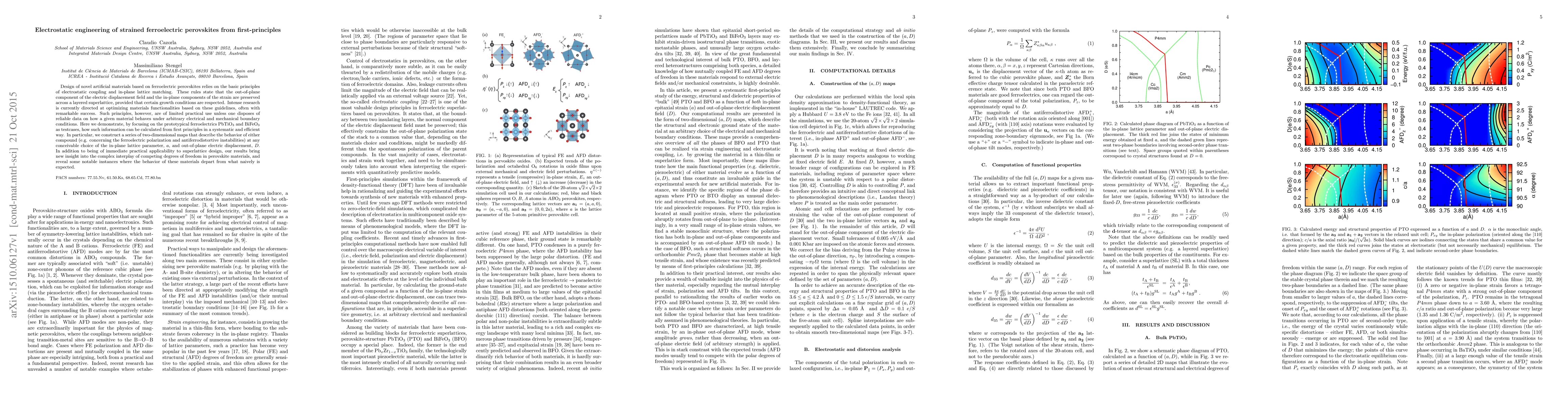 Design of novel artificial materials based on ferroelectric perovskites relies on the basic principles of electrostatic coupling and in-plane lattice matching. These rules state that the out-of-plane component of the electric displacement field and the in-plane components of the strain are preserved across a layered superlattice, provided that certain growth conditions are respected. Intense research is currently directed at optimizing materials functionalities based on these guidelines, often with remarkable success. Such principles, however, are of limited practical use unless one disposes of reliable data on how a given material behaves under arbitrary electrical and mechanical boundary conditions. Here we demonstrate, by focusing on the prototypical ferroelectrics PbTiO3 and BiFeO3 as testcases, how such information can be calculated from first principles in a systematic and efficient way. In particular, we construct a series of two-dimensional maps that describe the behavior of either compound (e.g. concerning the ferroelectric polarization and antiferrodistortive instabilities) at any conceivable choice of the in-plane lattice parameter, a, and out-of-plane electric displacement, D. In addition to being of immediate practical applicability to superlattice design, our results bring new insight into the complex interplay of competing degrees of freedom in perovskite materials, and reveal some notable instances where the behavior of these materials depart from what naively is expected.