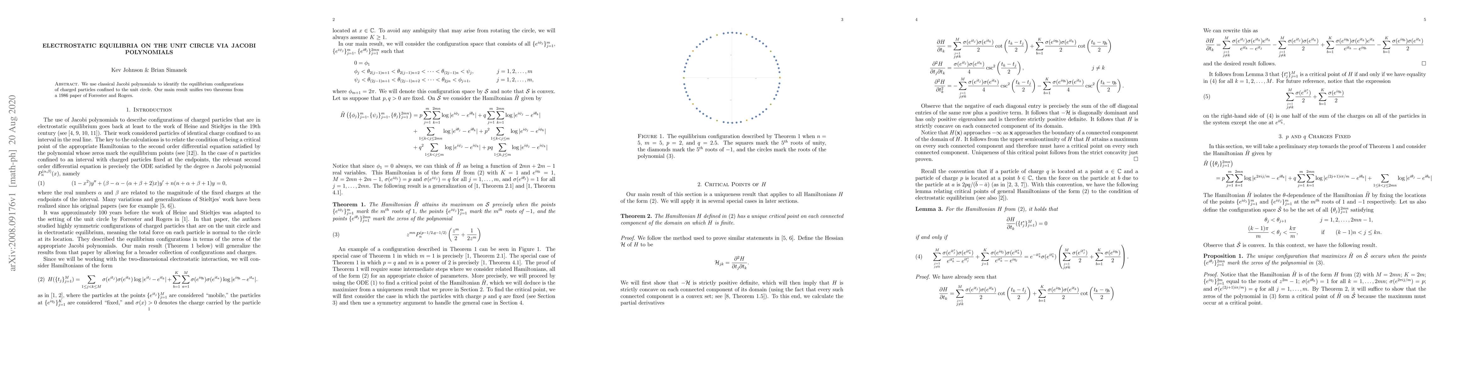 We use classical Jacobi polynomials to identify the equilibrium configurations of charged particles confined to the unit circle. Our main result unifies two theorems from a 1986 paper of Forrester and Rogers.