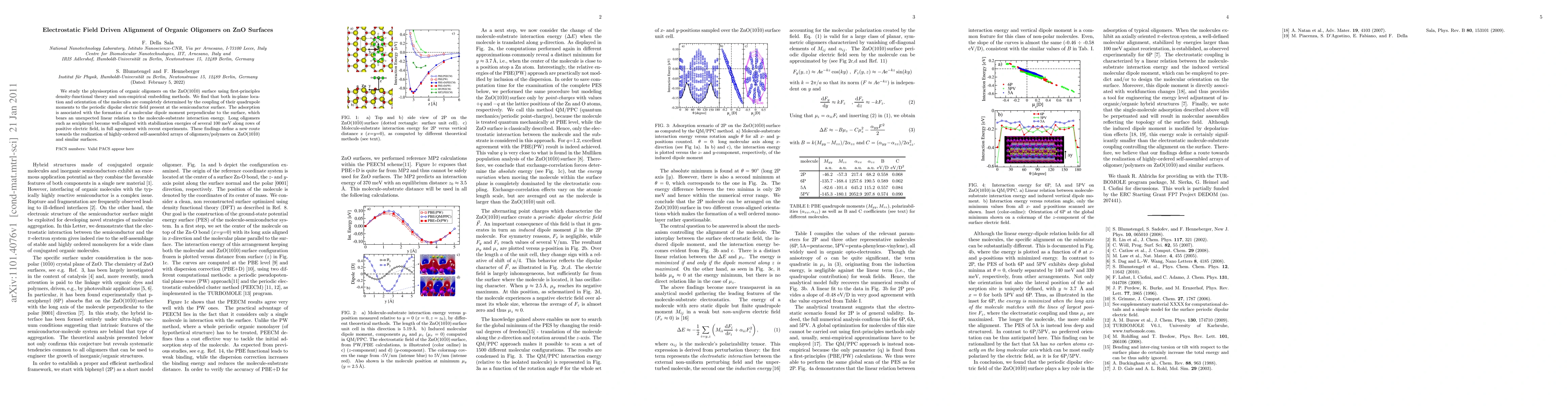 This study uses first-principles density-functional theory to investigate the physisorption of organic oligomers on ZnO surfaces, revealing that electrostatic fields dictate the alignment and orientation of the molecules. The findings suggest a method for creating highly-ordered self-assembled arrays of organic materials on ZnO surfaces.