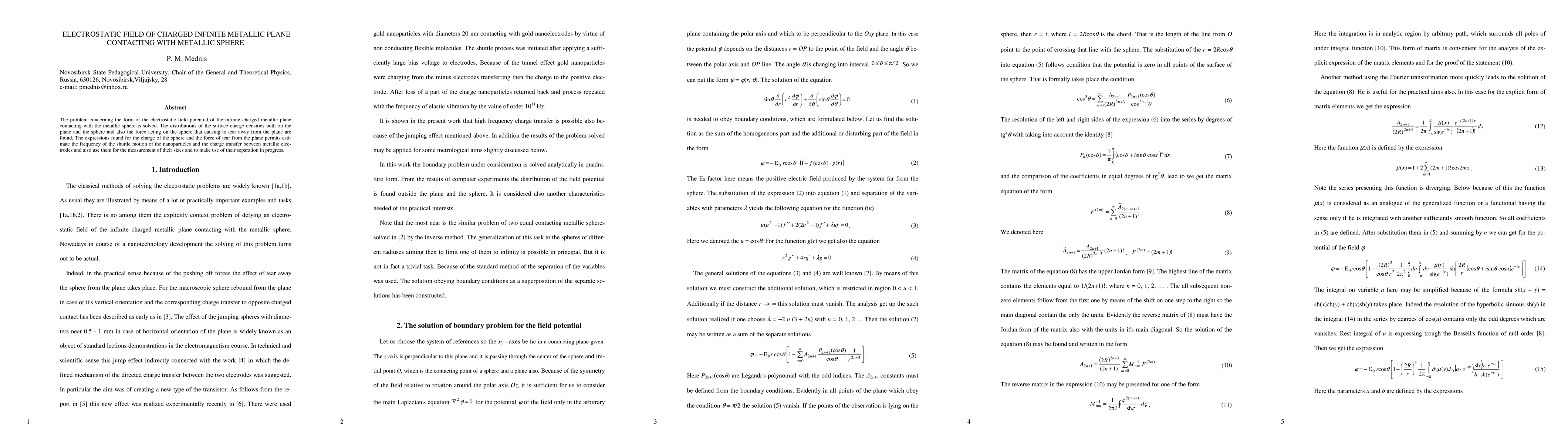 The problem concerning the form of the electrostatic field potential of the infinite charged metallic plane contacting with the metallic sphere is solved. The distributions of the surface charge densities both on the plane and the sphere and also the force acting on the sphere that causing to tear away from the plane are found. The expressions found for the charge of the sphere and the force of tear from the plane permits estimate the frequency of the shuttle motion of the nanoparticles and the charge transfer between metallic electrodes and also use them for the measurement of their sizes and to make use of their separation in progress.