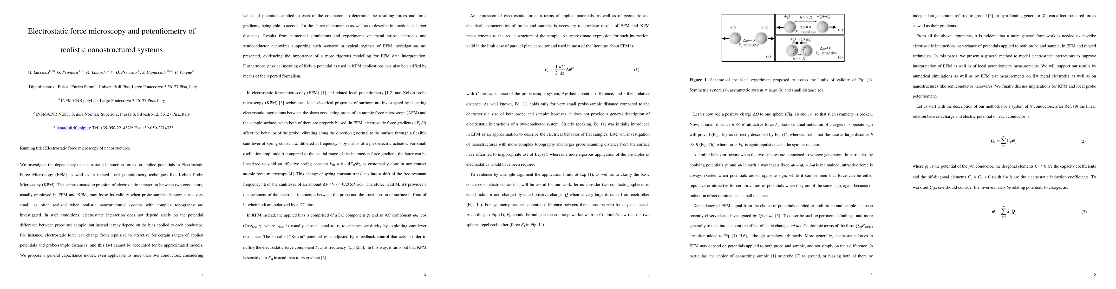 This paper proposes a general capacitance model to accurately describe electrostatic interactions in Electrostatic Force Microscopy (EFM) and Kelvin Probe Microscopy (KPM) for realistic nanostructured systems, addressing limitations of traditional models that fail at larger probe-sample distances. The new model accounts for potential differences applied to each conductor, explaining phenomena like force reversal and providing a clearer interpretation of Kelvin potential in KPM.