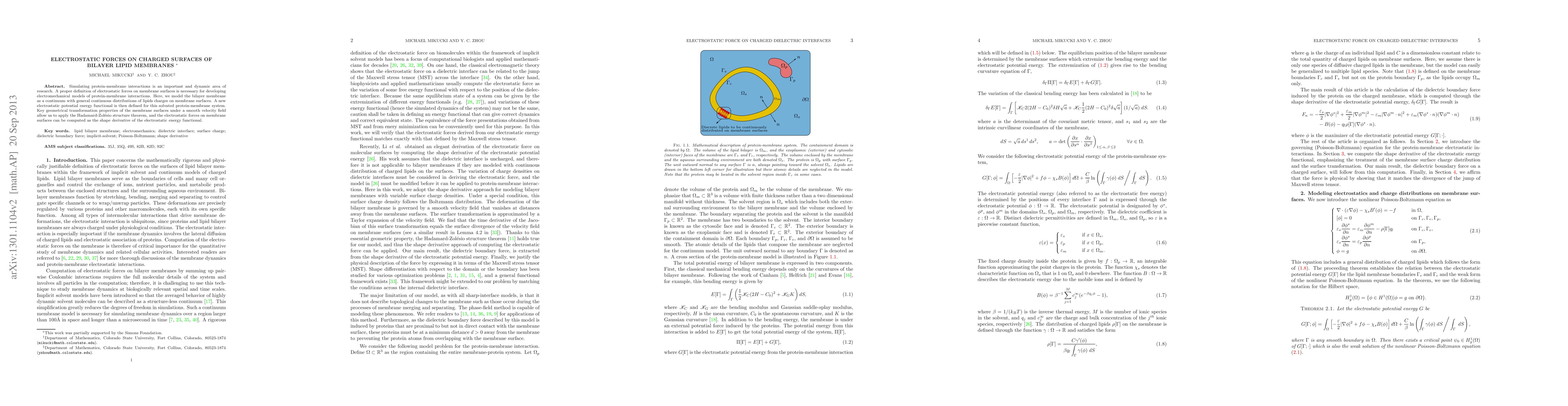 Simulating protein-membrane interactions is an important and dynamic area of research. A proper definition of electrostatic forces on membrane surfaces is necessary for developing electromechanical models of protein-membrane interactions. Here we modeled the bilayer membrane as a continuum with general continuous distributions of lipids charges on membrane surfaces. A new electrostatic potential energy functional was then defined for this solvated protein-membrane system. We investigated the geometrical transformation properties of the membrane surfaces under a smooth velocity field. These properties allows us to apply the Hadamard-Zolesio structure theorem, and the electrostatic forces on membrane surfaces can be computed as the shape derivative of the electrostatic energy functional.