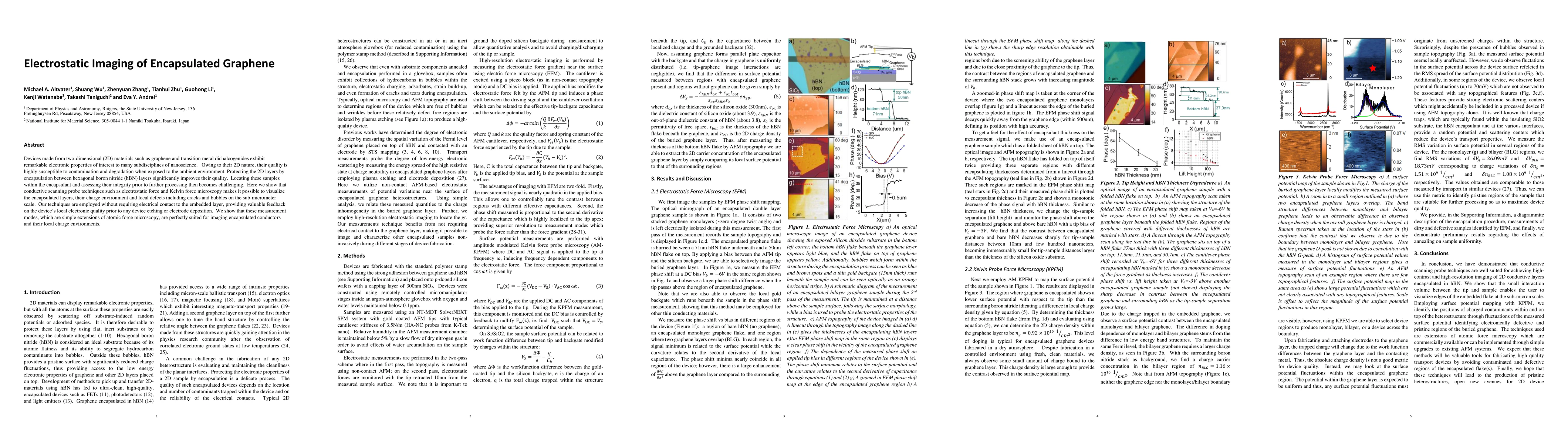 This paper demonstrates the use of electrostatic force and Kelvin force microscopy for imaging encapsulated graphene layers, allowing for visualization of the charge environment and local defects without electrical contact. This technique provides crucial feedback on the electronic quality of the graphene before device processing.