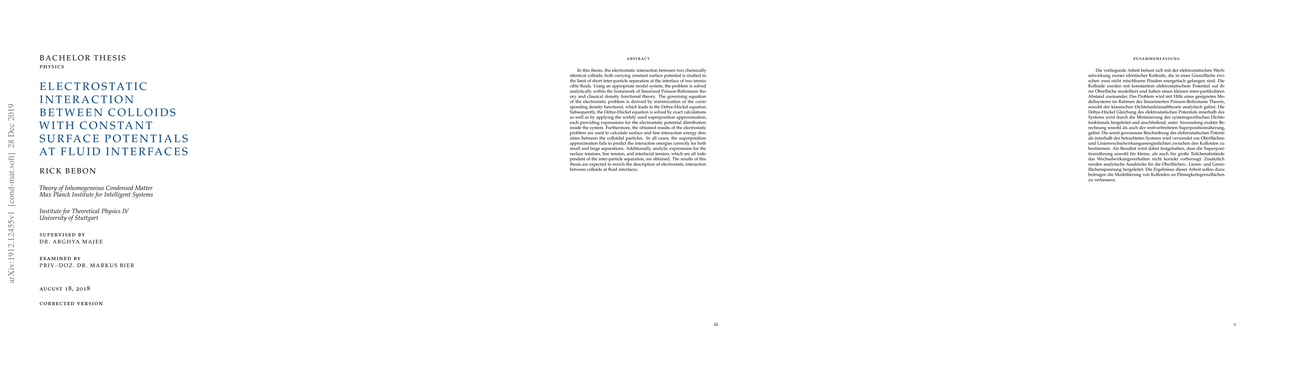 In this thesis, the electrostatic interaction between two chemically identical colloids, both carrying constant surface potential is studied in the limit of short inter-particle separation at the interface of two immiscible fluids. Using an appropriate model system, the problem is solved analytically within the framework of linearized Poisson-Boltzmann theory and classical density functional theory. The governing equation of the electrostatic problem is derived by minimization of the corresponding density functional, which leads to the Debye-H\"uckel equation. Subsequently, the Debye-H\"uckel equation is solved by exact calculations as well as by applying the widely used superposition approximation, each providing expressions for the electrostatic potential distribution inside the system. Furthermore, the obtained results of the electrostatic problem are used to calculate surface and line interaction energy densities between the colloidal particles. In all cases, the superposition approximation fails to predict the interaction energies correctly for both small and large separations. Additionally, analytic expressions for the surface tensions, line tension, and interfacial tension, which are all independent of the inter-particle separation, are obtained. The results of this thesis are expected to enrich the description of electrostatic interaction between colloids at fluid interfaces.