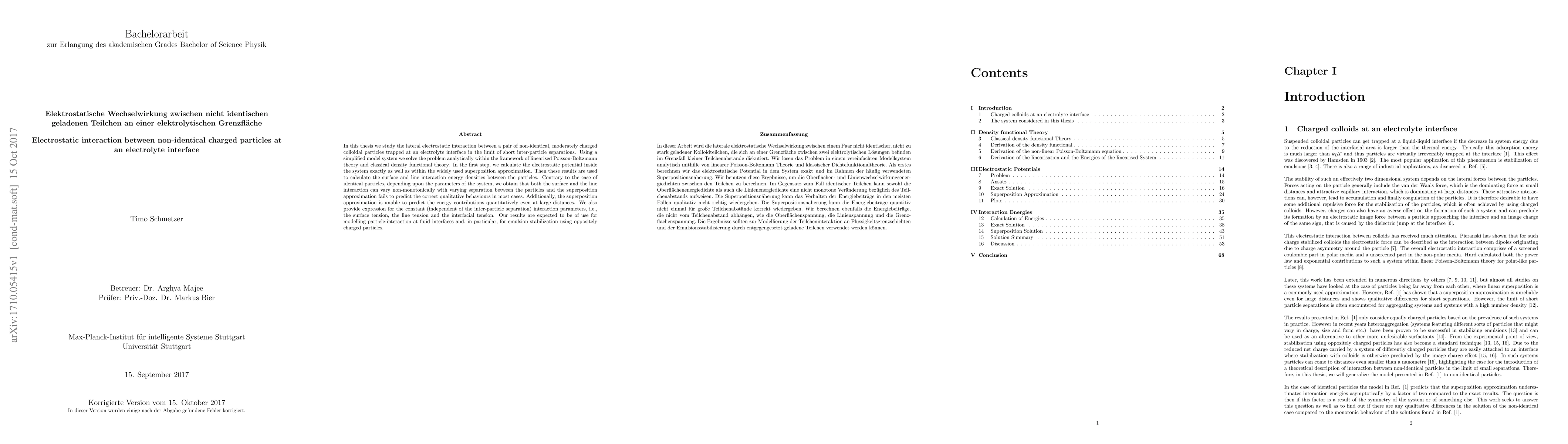 In this thesis we study the lateral electrostatic interaction between a pair of non-identical, moderately charged colloidal particles trapped at an electrolyte interface in the limit of short inter-particle separations. Using a simplified model system we solve the problem analytically within the framework of linearised Poisson-Boltzmann theory and classical density functional theory. In the first step, we calculate the electrostatic potential inside the system exactly as well as within the widely used superposition approximation. Then these results are used to calculate the surface and line interaction energy densities between the particles. Contrary to the case of identical particles, depending upon the parameters of the system, we obtain that both the surface and the line interaction can vary non-monotonically with varying separation between the particles and the superposition approximation fails to predict the correct qualitative behaviours in most cases. Additionally, the superposition approximation is unable to predict the energy contributions quantitatively even at large distances. We also provide expression for the constant (independent of the inter-particle separation) interaction parameters, i.e., the surface tension, the line tension and the interfacial tension. Our results are expected to be of use for modelling particle-interaction at fluid interfaces and, in particular, for emulsion stabilization using oppositely charged particles.