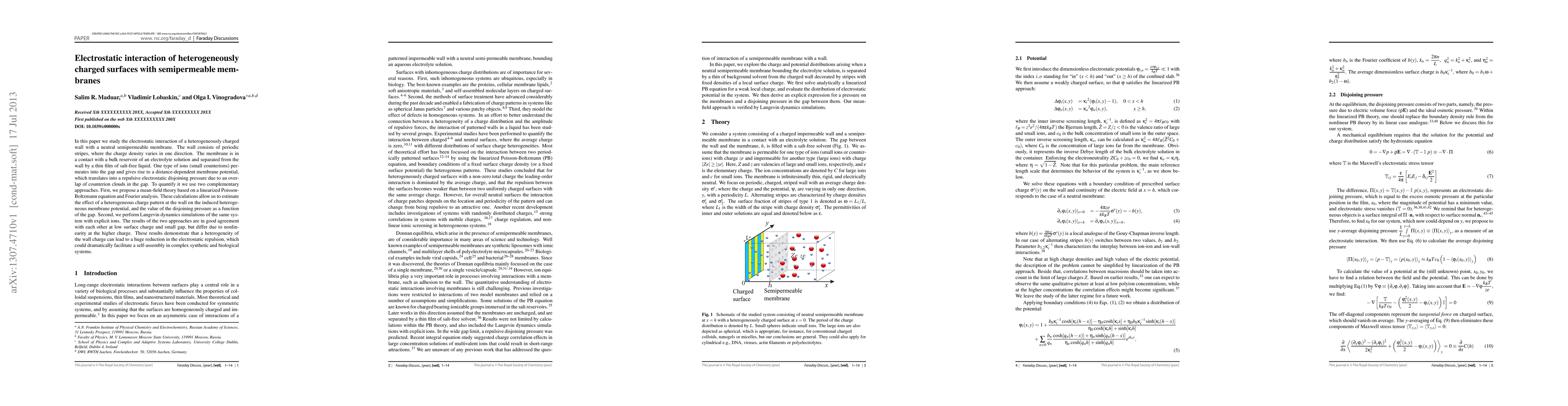 In this paper we study the electrostatic interaction of a heterogeneously charged wall with a neutral semipermeable membrane. The wall consists of periodic stripes, where the charge density varies in one direction. The membrane is in a contact with a bulk reservoir of an electrolyte solution and separated from the wall by a thin film of salt-free liquid. One type of ions (small counterions) permeates into the gap and gives rise to a distance-dependent membrane potential, which translates into a repulsive electrostatic disjoining pressure due to an overlap of counterion clouds in the gap. To quantify it we use two complementary approaches. First, we propose a mean-field theory based on a linearized Poisson-Boltzmann equation and Fourier analysis. These calculations allow us to estimate the effect of a heterogeneous charge pattern at the wall on the induced heterogeneous membrane potential, and the value of the disjoining pressure as a function of the gap. Second, we perform Langevin dynamics simulations of the same system with explicit ions. The results of the two approaches are in good agreement with each other at low surface charge and small gap, but differ due to nonlinearity at the higher charge. These results demonstrate that a heterogeneity of the wall charge can lead to a huge reduction in the electrostatic repulsion, which could dramatically facilitate a self-assembly in complex synthetic and biological systems.
