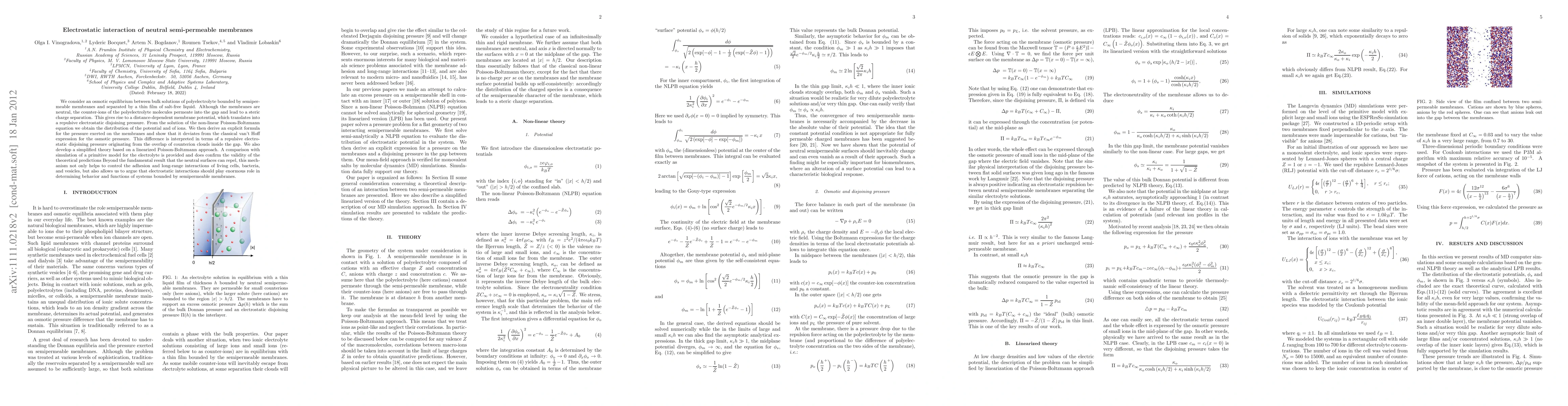 We consider an osmotic equilibrium between bulk solutions of polyelectrolyte bounded by semipermeable membranes and separated by a thin film of salt-free liquid. Although the membranes are neutral, the counter-ions of the polyelectrolyte molecules permeate into the gap and lead to a steric charge separation. This gives rise to a distance-dependent membrane potential, which translates into a repulsive electrostatic disjoining pressure. From the solution of the non-linear Poisson-Boltzmann equation we obtain the distribution of the potential and of ions. We then derive an explicit formula for the pressure exerted on the membranes and show that it deviates from the classical van't Hoff expression for the osmotic pressure. This difference is interpreted in terms of a repulsive electrostatic disjoining pressure originating from the overlap of counterion clouds inside the gap. We also develop a simplified theory based on a linearized Poisson-Boltzmann approach. A comparison with simulation of a primitive model for the electrolyte is provided and does confirm the validity of the theoretical predictions Beyond the fundamental result that the neutral surfaces can repel, this mechanism not only helps to control the adhesion and long-range interactions of living cells, bacteria, and vesicles, but also allows us to argue that electrostatic interactions should play enormous role in determining behavior and functions of systems bounded by semipermeable membranes.