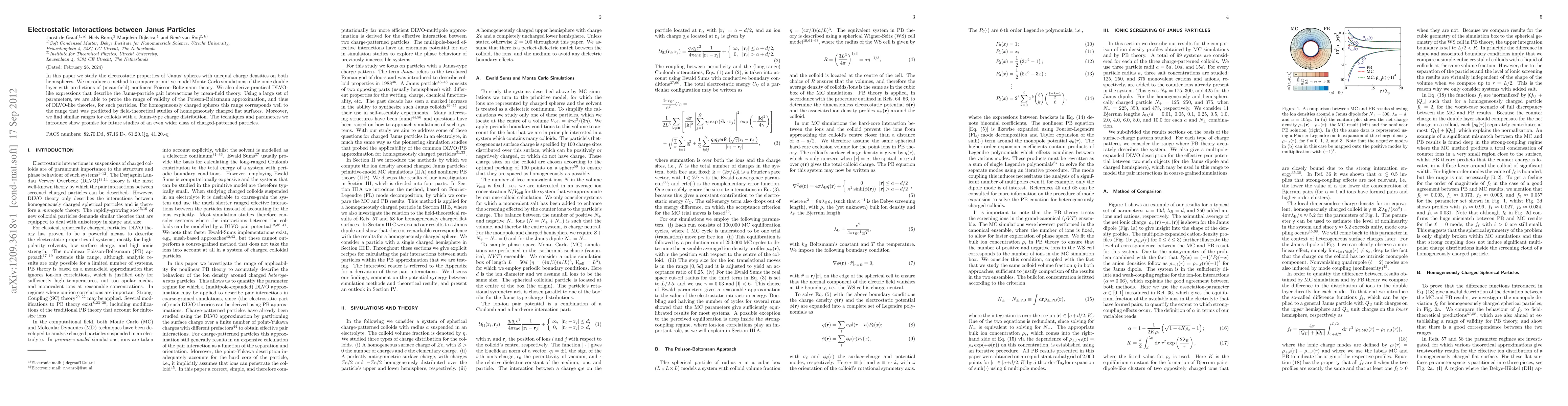 This paper investigates the electrostatic interactions of Janus spheres with differing charge densities on each hemisphere, comparing Monte Carlo simulations with nonlinear Poisson-Boltzmann theory. It also develops DLVO-like expressions for Janus particle interactions, finding similar ranges of validity for Janus particles as for homogeneously charged spheres.