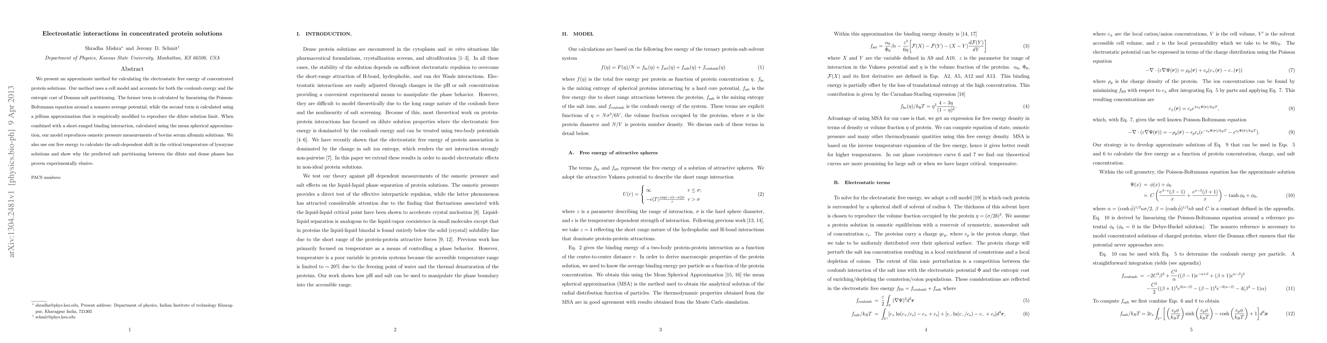 This paper proposes an approximate method for calculating the electrostatic free energy in concentrated protein solutions, combining a cell model with linearized Poisson-Boltzmann and jellium approximations to account for electrostatic and entropic effects. The model successfully reproduces osmotic pressure measurements and explains the salt-dependent shift in lysozyme's critical temperature.