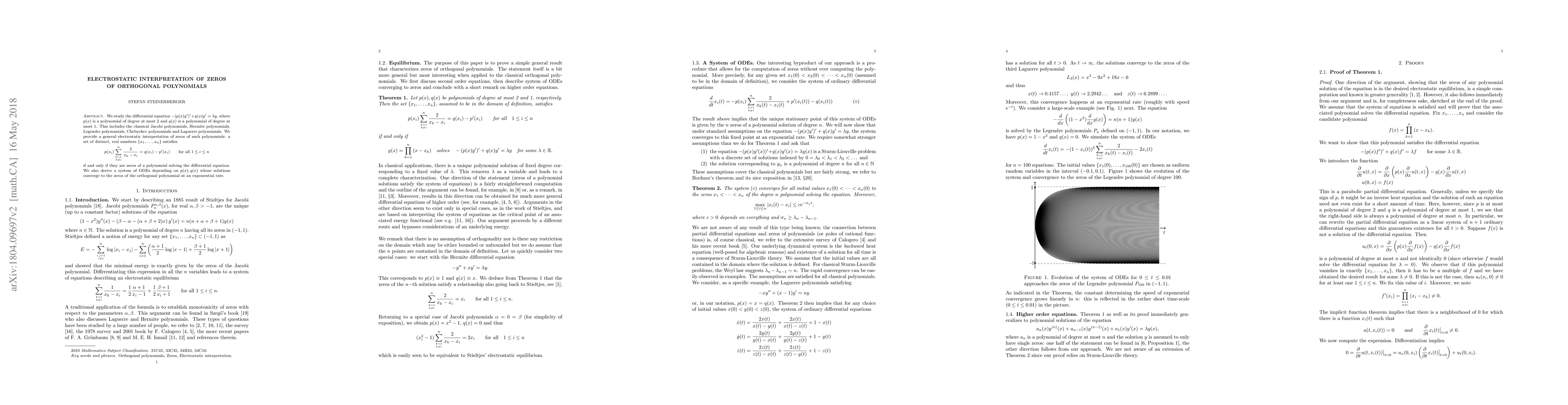 The paper presents an electrostatic interpretation of zeros of orthogonal polynomials, analyzing the differential equation - (p(x) y')' + q(x) y' = λ y, where p(x) is a polynomial of degree at most 2 and q(x) is a polynomial of degree at most 1. The authors derive a system of ODEs that converge to the zeros of the orthogonal polynomial at an exponential rate.