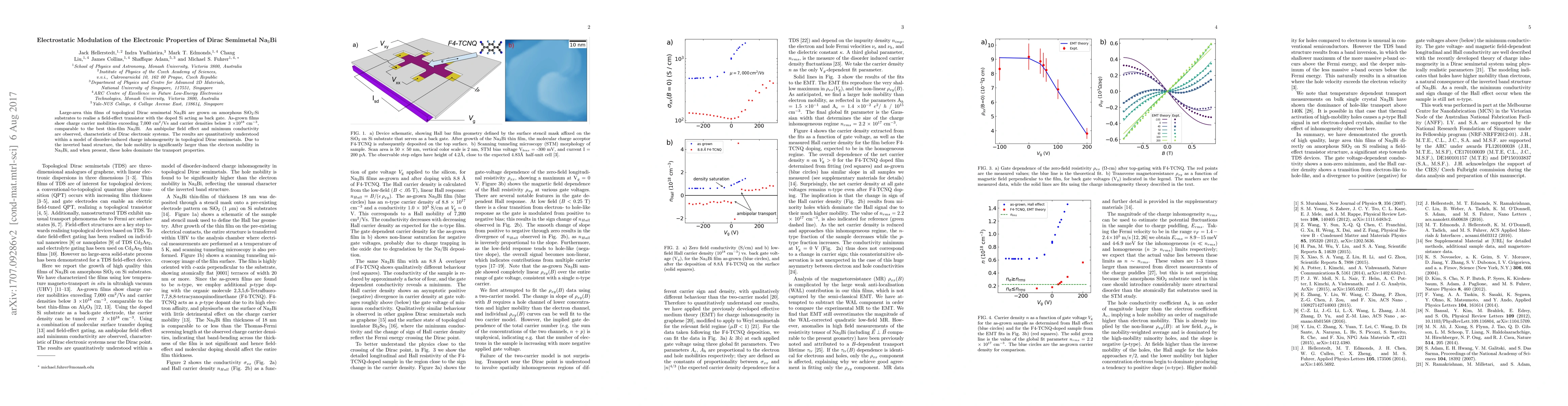 Large-area thin films of topological Dirac semimetal Na$_3$Bi are grown on amorphous SiO$_2$:Si substrates to realise a field-effect transistor with the doped Si acting as back gate. As-grown films show charge carrier mobilities exceeding 7,000 cm$^2$/Vs and carrier densities below 3 $\times $10$^{18}$ cm$^{-3}$, comparable to the best thin-film Na$_3$Bi. An ambipolar field effect and minimum conductivity are observed, characteristic of Dirac electronic systems. The results are quantitatively understood within a model of disorder-induced charge inhomogeneity in topological Dirac semimetals. Due to the inverted band structure, the hole mobility is significantly larger than the electron mobility in Na$_3$Bi, and when present, these holes dominate the transport properties.