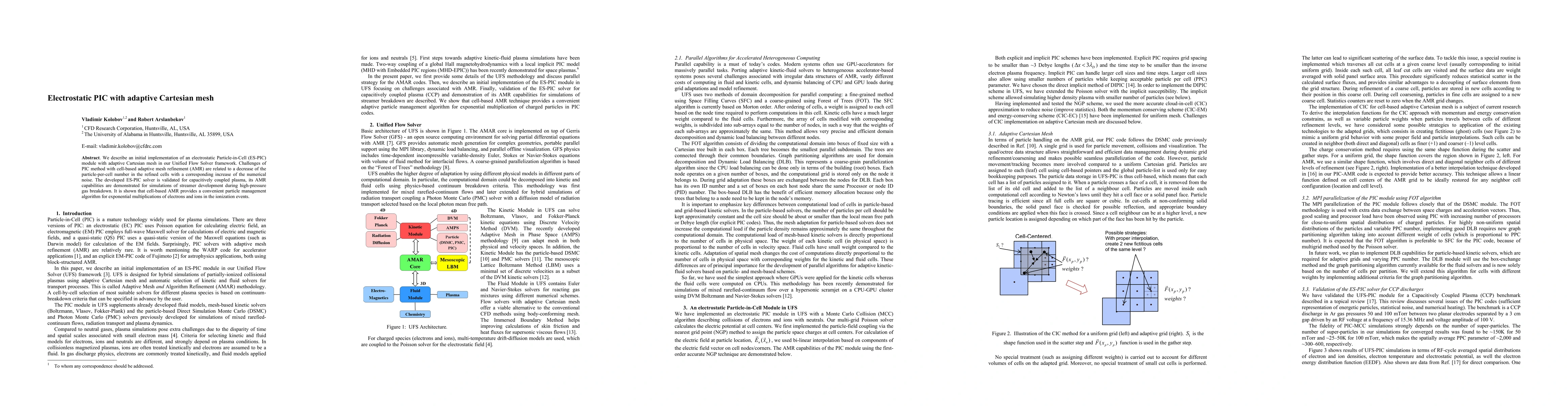 This paper presents an initial implementation of an electrostatic Particle-in-Cell (ES-PIC) module with adaptive Cartesian mesh in a Unified Flow Solver framework, addressing challenges of numerical noise due to decreased particle-per-cell ratios in refined cells. The developed ES-PIC solver is validated for capacitively coupled plasma and demonstrates effective adaptive mesh refinement during high-pressure gas breakdown simulations.
