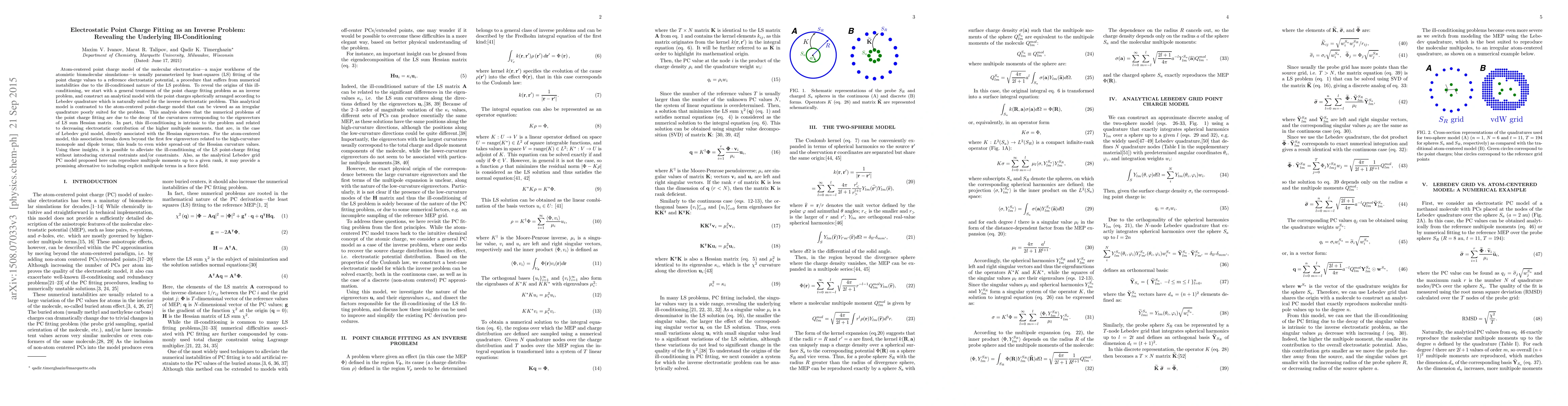 Atom-centered point charge model of the molecular electrostatics---a major workhorse of the atomistic biomolecular simulations---is usually parameterized by least-squares (LS) fitting of the point charge values to a reference electrostatic potential, a procedure that suffers from numerical instabilities due to the ill-conditioned nature of the LS problem. Here, to reveal the origins of this ill-conditioning, we start with a general treatment of the point charge fitting problem as an inverse problem, and construct an analytically soluble model with the point charges spherically arranged according to Lebedev quadrature naturally suited for the inverse electrostatic problem. This analytical model is contrasted to the atom-centered point-charge model that can be viewed as an irregular quadrature poorly suited for the problem. This analysis shows that the numerical problems of the point charge fitting are due to the decay of the curvatures corresponding to the eigenvectors of LS sum Hessian matrix. In part, this ill-conditioning is intrinsic to the problem and related to decreasing electrostatic contribution of the higher multipole moments, that are, in the case of Lebedev grid model, directly associated with the Hessian eigenvectors. For the atom-centered model, this association breaks down beyond the first few eigenvectors related to the high-curvature monopole and dipole terms; this leads to even wider spread-out of the Hessian curvature values. Using these insights, it is possible to alleviate the ill-conditioning of the LS point-charge fitting without introducing external restraints and/or constraints. Also, as the analytical Lebedev grid PC model proposed here can reproduce multipole moments up to a given rank, it may provide a promising alternative to including explicit multipole terms in a force field.
