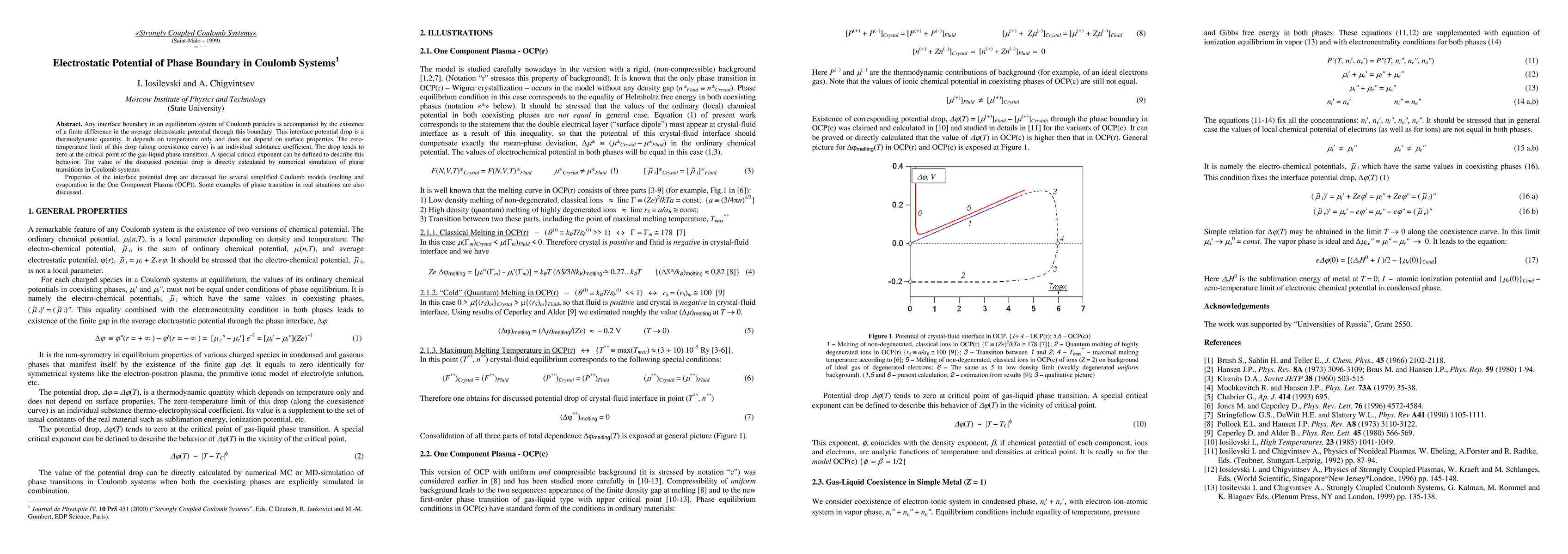 Any interface boundary in an equilibrium system of Coulomb particles is accompanied by the existence of a finite difference in the average electrostatic potential through this boundary. This interface potential drop is a thermodynamic quantity. It depends on temperature only and does not depend on surface properties. The zero-temperature limit of this drop (along coexistence curve) is an individual substance coefficient. The drop tends to zero at the critical point of the gas-liquid phase transition. A special critical exponent can be defined to describe this behavior. The value of the discussed potential drop is directly calculated by numerical simulation of phase transitions in Coulomb systems. Properties of the interface potential drop are discussed for several simplified Coulomb models (melting and evaporation in the One Component Plasma (OCP)). Some examples of phase transition in real situations are also discussed.