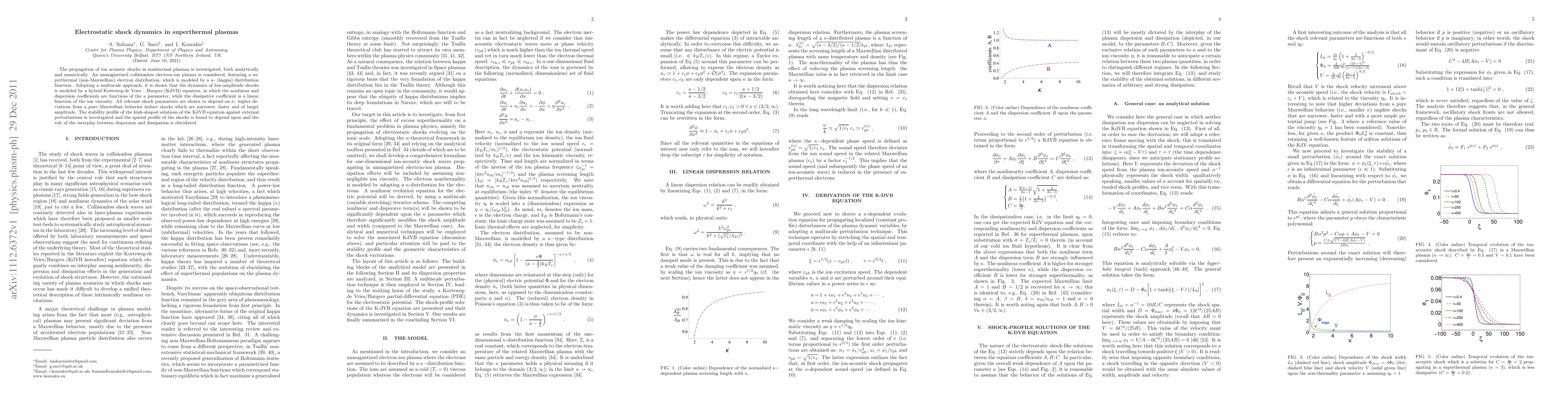 The propagation of ion acoustic shocks in nonthermal plasmas is investigated, both analytically and numerically. An unmagnetized collisionless electron-ion plasma is considered, featuring a superthermal (non-Maxwellian) electron distribution, which is modeled by a $\kappa$- (kappa) distribution function. Adopting a multiscale approach, it is shown that the dynamics of low-amplitude shocks is modeled by a hybrid Korteweg-de Vries -- Burgers (KdVB) equation, in which the nonlinear and dispersion coefficients are functions of the $\kappa$ parameter, while the dissipative coefficient is a linear function of the ion viscosity. All relevant shock parameters are shown to depend on $\kappa$: higher deviations from a pure Maxwellian behavior induce shocks which are narrower, faster and of larger amplitude. The stability profile of the kink-shaped solutions of the KdVB equation against external perturbations is investigated and the spatial profile of the shocks is found to depend upon and the role of the interplay between dispersion and dissipation is elucidated.