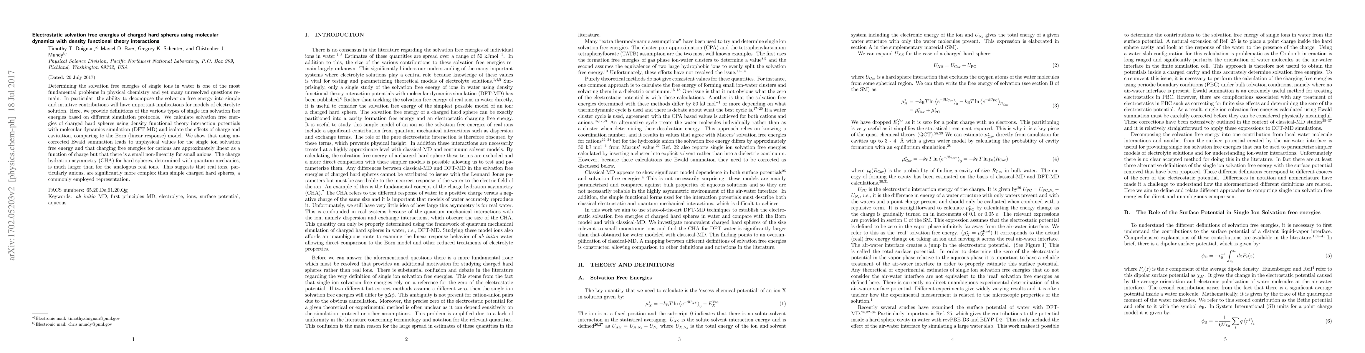 This paper investigates the solvation free energies of charged hard spheres in water using DFT-MD simulations, revealing that uncorrected Ewald summation yields unphysical results. It finds that charge hydration asymmetry for hard spheres is significantly larger than for real ions, indicating that real ions, especially anions, are more complex.