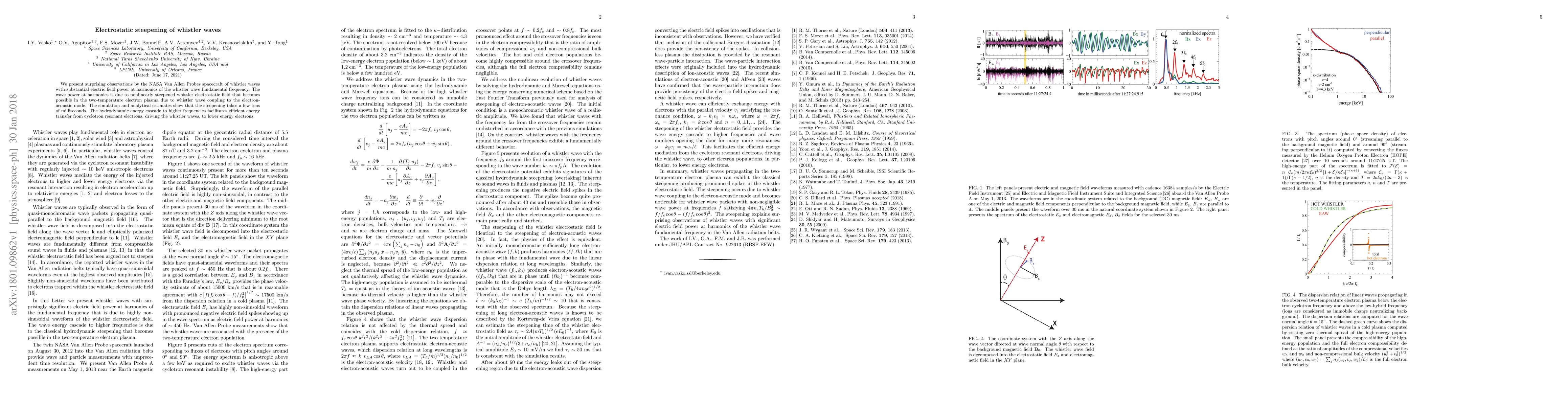 We present surprising observations by the NASA Van Allen Probes spacecraft of whistler waves with substantial electric field power at harmonics of the whistler wave fundamental frequency. The wave power at harmonics is due to nonlinearly steepened whistler electrostatic field that becomes possible in the two-temperature electron plasma due to whistler wave coupling to the electron-acoustic mode. The simulation and analytical estimates show that the steepening takes a few tens of milliseconds. The hydrodynamic energy cascade to higher frequencies facilitates efficient energy transfer from cyclotron resonant electrons, driving the whistler waves, to lower energy electrons.