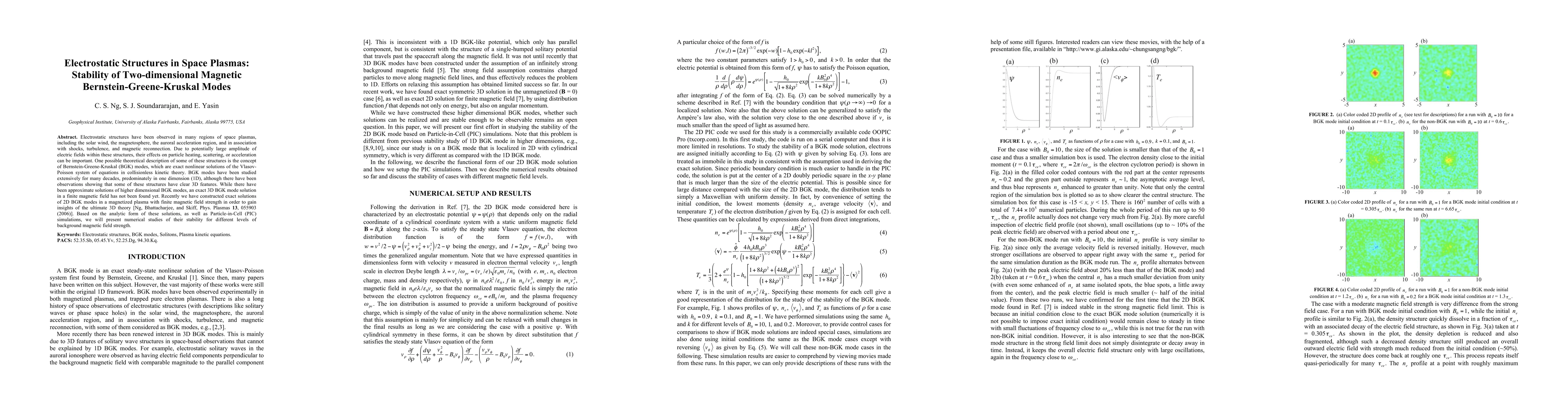 Electrostatic structures have been observed in many regions of space plasmas, including the solar wind, the magnetosphere, the auroral acceleration region, and in association with shocks, turbulence, and magnetic reconnection. Due to potentially large amplitude of electric fields within these structures, their effects on particle heating, scattering, or acceleration can be important. One possible theoretical description of some of these structures is the concept of Bernstein-Greene-Kruskal (BGK) modes, which are exact nonlinear solutions of the Vlasov-Poisson system of equations in collisionless kinetic theory. BGK modes have been studied extensively for many decades, predominately in one dimension (1D), although there have been observations showing that some of these structures have clear 3D features. While there have been approximate solutions of higher dimensional BGK modes, an exact 3D BGK mode solution in a finite magnetic field has not been found yet. Recently we have constructed exact solutions of 2D BGK modes in a magnetized plasma with finite magnetic field strength in order to gain insights of the ultimate 3D theory [Ng, Bhattacharjee, and Skiff, Phys. Plasmas 13, 055903 (2006)]. Based on the analytic form of these solutions, as well as Particle-in-Cell (PIC) simulations, we will present numerical studies of their stability for different levels of background magnetic field strength.