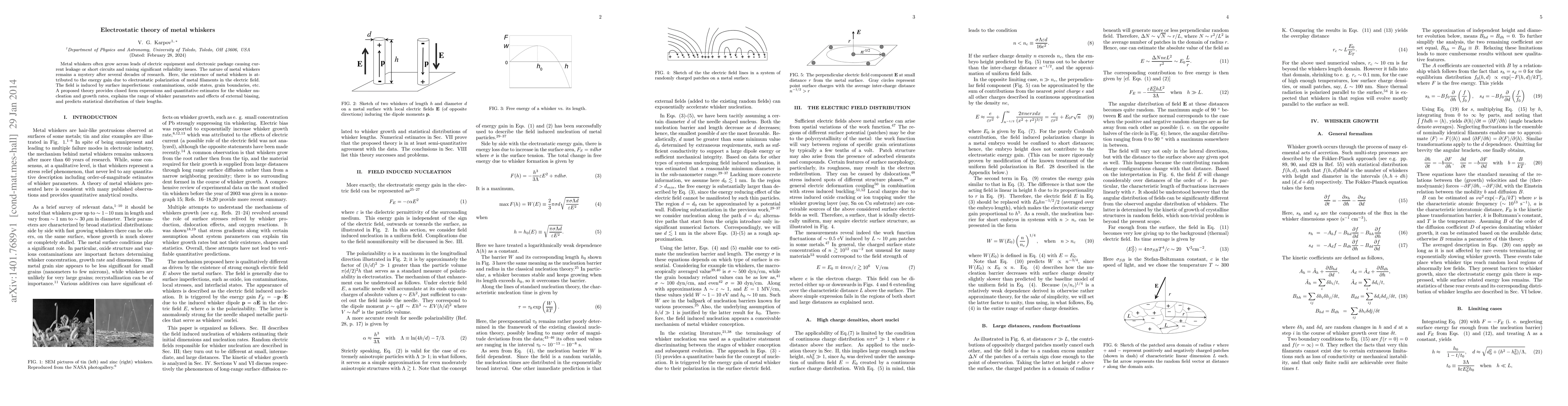 This paper proposes an electrostatic theory explaining the growth of metal whiskers, attributing their formation to energy gain from electrostatic polarization in electric fields induced by surface imperfections. The theory provides quantitative estimates for whisker nucleation and growth rates, explains their parameter range, and predicts their statistical length distribution.