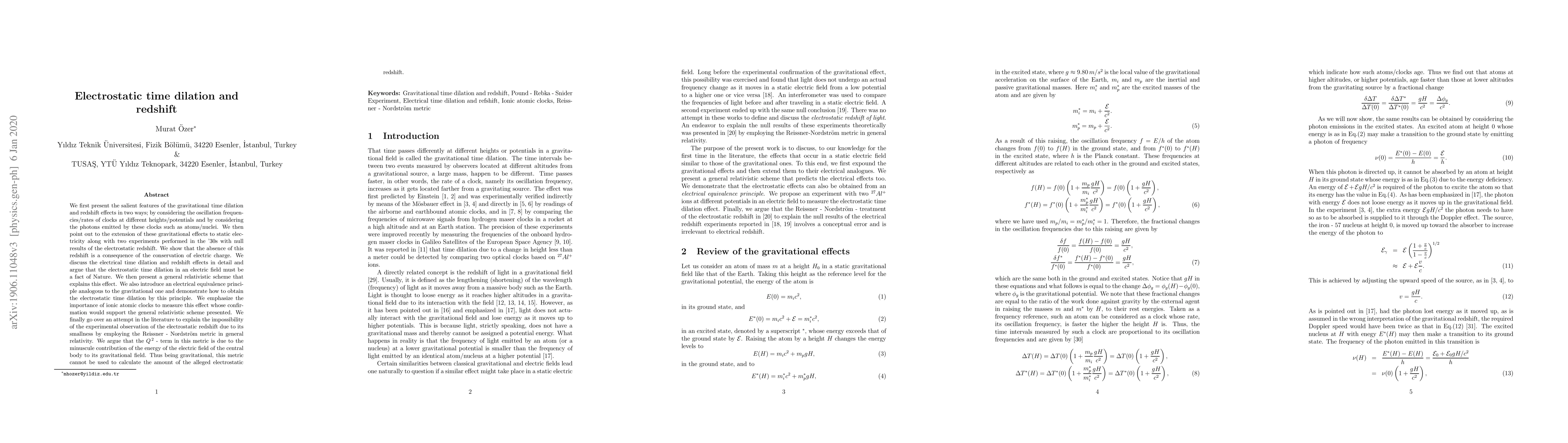This paper explores the extension of gravitational time dilation and redshift to electrostatic fields, arguing for the existence of electrostatic time dilation in electric fields. It proposes an electrical equivalence principle and emphasizes the need for ionic atomic clocks to confirm this effect, while critiquing the use of the Reissner-Nordström metric for explaining the lack of observed electrostatic redshift.