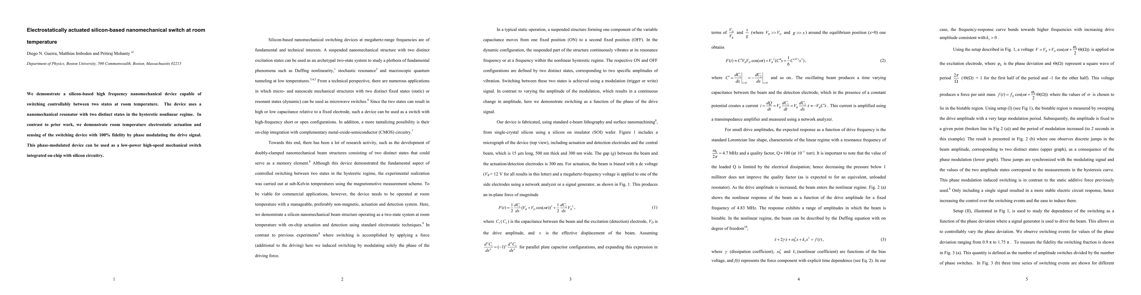 This paper presents a silicon-based nanomechanical switch that operates at room temperature with 100% fidelity through electrostatic actuation. The device utilizes a nanomechanical resonator in a hysteretic nonlinear regime, enabling controllable switching between two states with phase modulation of the drive signal.