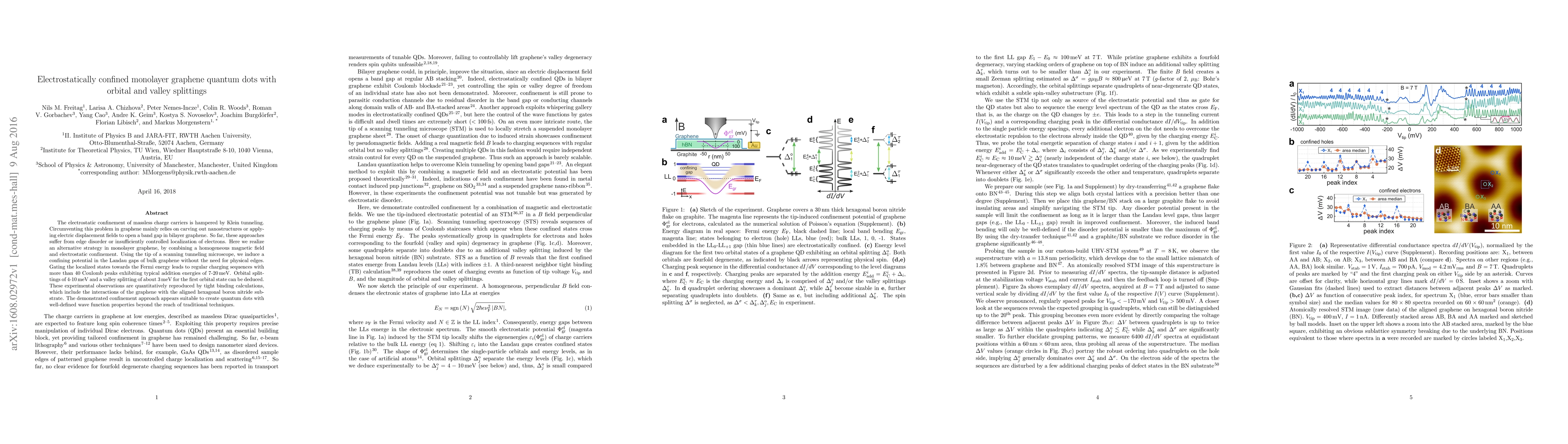 This research demonstrates a novel method to confine electrons in monolayer graphene using a magnetic field and electrostatic potential, bypassing Klein tunneling issues. The approach, utilizing a scanning tunneling microscope, results in well-defined, localized states with observed orbital and valley splittings, offering a promising technique for creating quantum dots with controlled properties.
