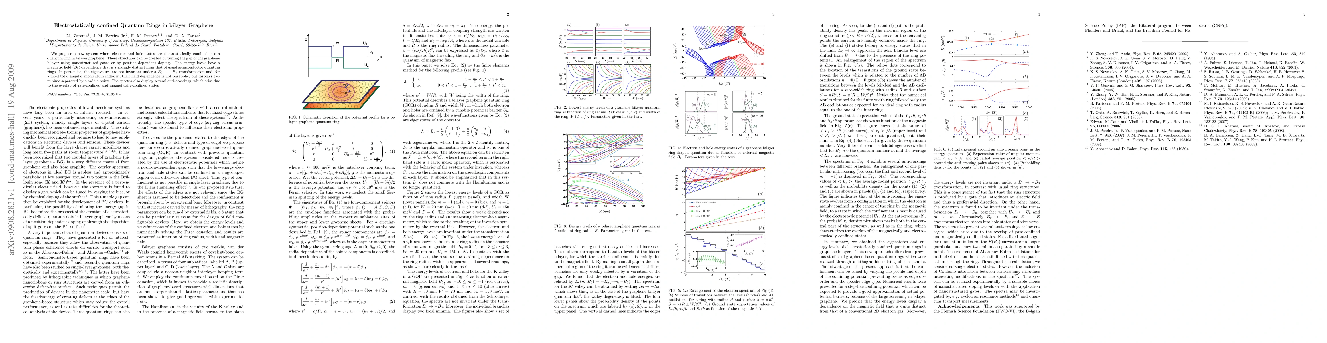 This paper introduces electrostatically confined quantum rings in bilayer graphene, revealing unique magnetic field-dependent energy levels that differ from conventional semiconductor rings, including non-parabolic field dependence and anti-crossing phenomena due to state overlaps.