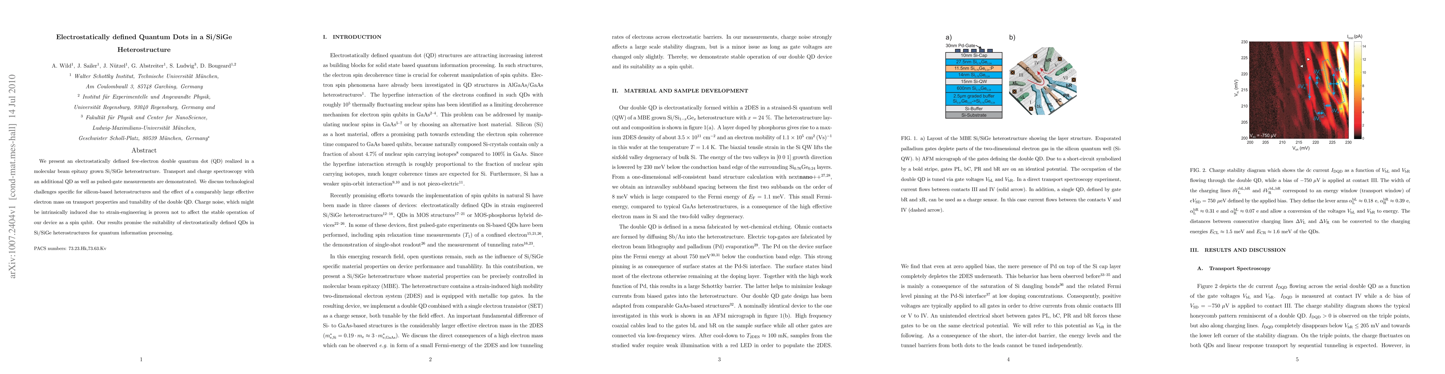 The paper reports on the fabrication and characterization of an electrostatically defined few-electron double quantum dot in a Si/SiGe heterostructure, demonstrating transport and charge spectroscopy. The study highlights the potential of such structures for quantum information processing despite challenges in silicon-based heterostructures and intrinsic charge noise.