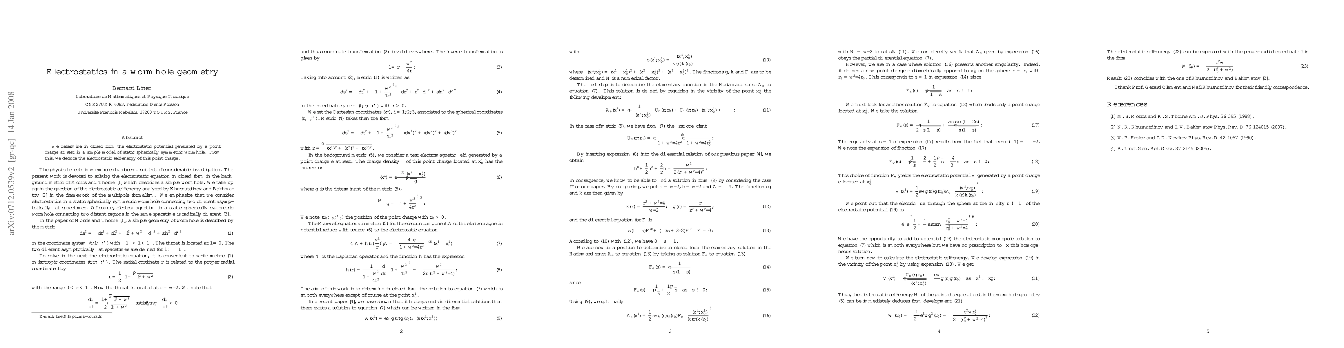 We determine in closed form the electrostatic potential generated by a point charge at rest in a simple model of static spherically symmetric wormhole. From this, we deduce the electrostatic self-energy of this point charge.