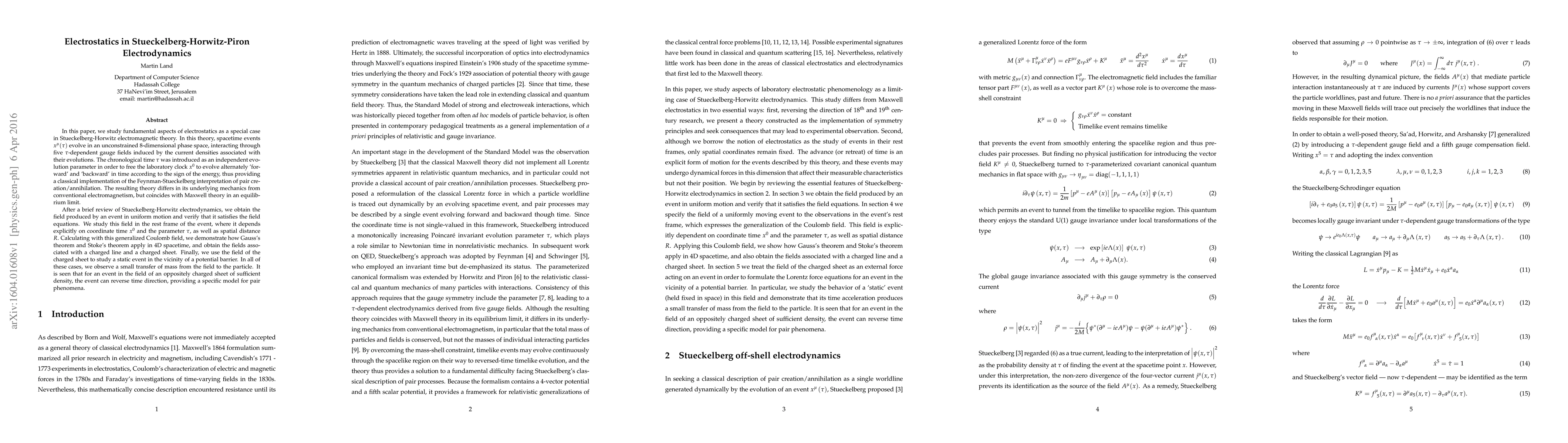 In this paper, we study fundamental aspects of electrostatics as a special case in Stueckelberg-Horwitz electromagnetic theory. In this theory, spacetime events $x^\mu(\tau)$ evolve in an unconstrained 8-dimensional phase space, interacting through five $\tau$-dependent gauge fields induced by the current densities associated with their evolutions. The chronological time $\tau$ was introduced as an independent evolution parameter in order to free the laboratory clock $x^0$ to evolve alternately 'forward' and 'backward' in time according to the sign of the energy, thus providing a classical implementation of the Feynman-Stueckelberg interpretation of pair creation/annihilation. The resulting theory differs in its underlying mechanics from conventional electromagnetism, but coincides with Maxwell theory in an equilibrium limit. After a brief review of Stueckelberg-Horwitz electrodynamics, we obtain the field produced by an event in uniform motion and verify that it satisfies the field equations. We study this field in the rest frame of the event, where it depends explicitly on coordinate time $x^0$ and the parameter $\tau$, as well as spatial distance $R$. Calculating with this generalized Coulomb field, we demonstrate how Gauss's theorem and Stoke's theorem apply in 4D spacetime, and obtain the fields associated with a charged line and a charged sheet. Finally, we use the field of the charged sheet to study a static event in the vicinity of a potential barrier. In all of these cases, we observe a small transfer of mass from the field to the particle. It is seen that for an event in the field of an oppositely charged sheet of sufficient density, the event can reverse time direction, providing a specific model for pair phenomena.