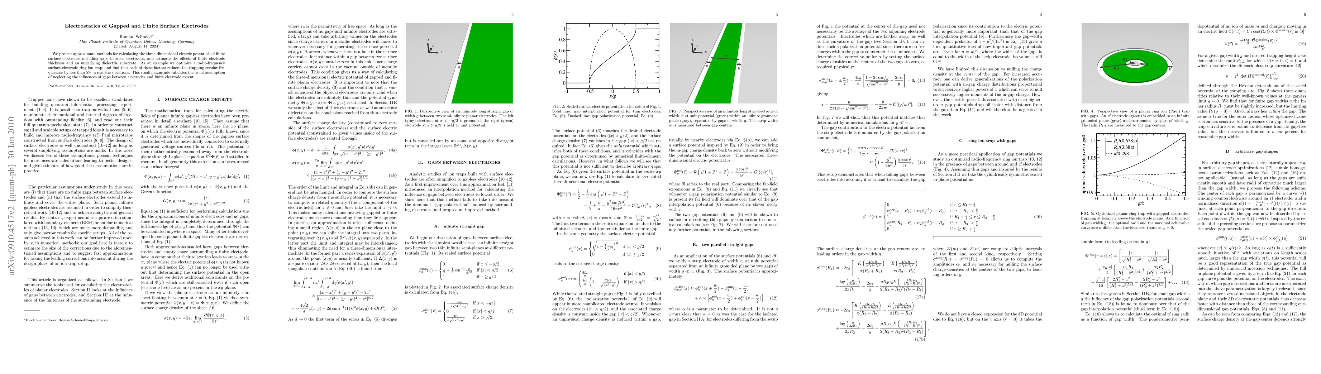 Researchers develop approximate methods to calculate electric potentials of finite surface electrodes with gaps, finding that finite thickness and substrate have a small impact on trapping frequencies, validating the usual assumption of neglecting these factors.