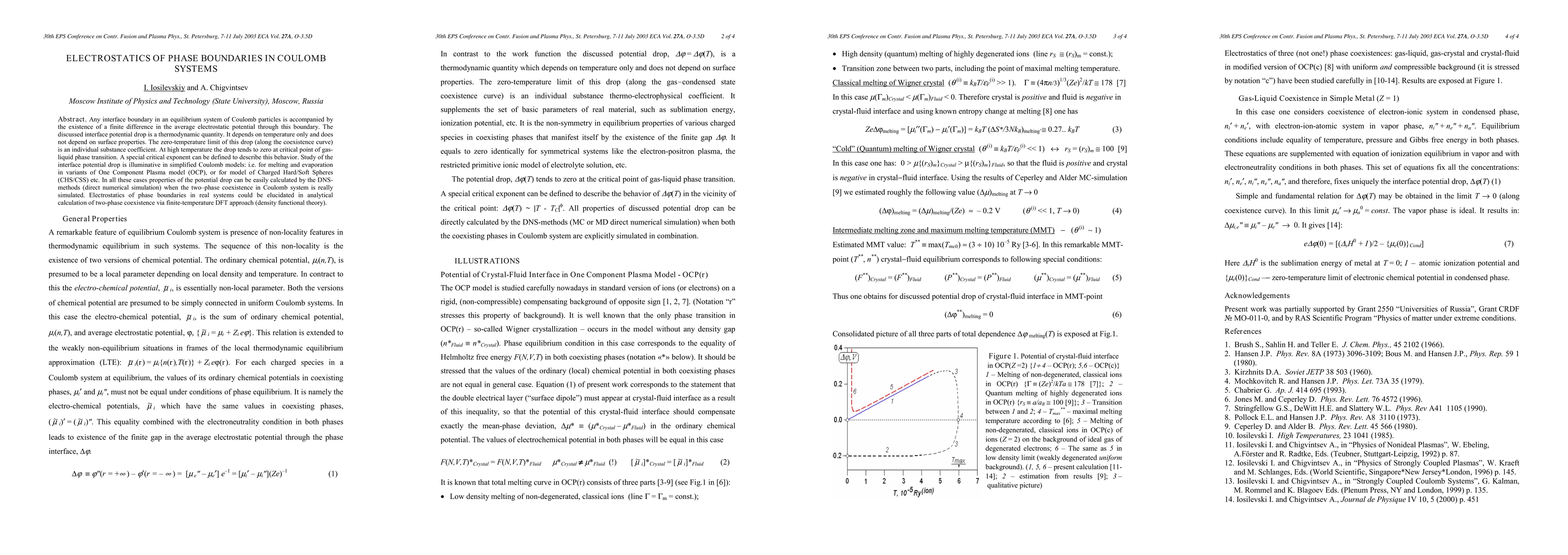 Any interface boundary in an equilibrium system of Coulomb particles is accompanied by the existence of a finite difference in the average electrostatic potential through this boundary. The discussed interface potential drop is a thermodynamic quantity. It depends on temperature only and does not depend on surface properties. The zero-temperature limit of this drop (along the coexistence curve) is an individual substance coefficient. At high temperature the drop tends to zero at critical point of gasliquid phase transition. A special critical exponent can be defined to describe this behavior. Study of the interface potential drop is illuminative in simplified Coulomb models: i.e. for melting and evaporation in variants of One Component Plasma model (OCP), or for model of Charged Hard/Soft Spheres (CHS/CSS) etc. In all these cases properties of the potential drop can be easily calculated by the DNS methods (direct numerical simulation) when the two-phase coexistence in Coulomb system is really simulated. Electrostatics of phase boundaries in real systems could be elucidated in analytical calculation of two-phase coexistence via finite-temperature DFT approach (density functional theory).