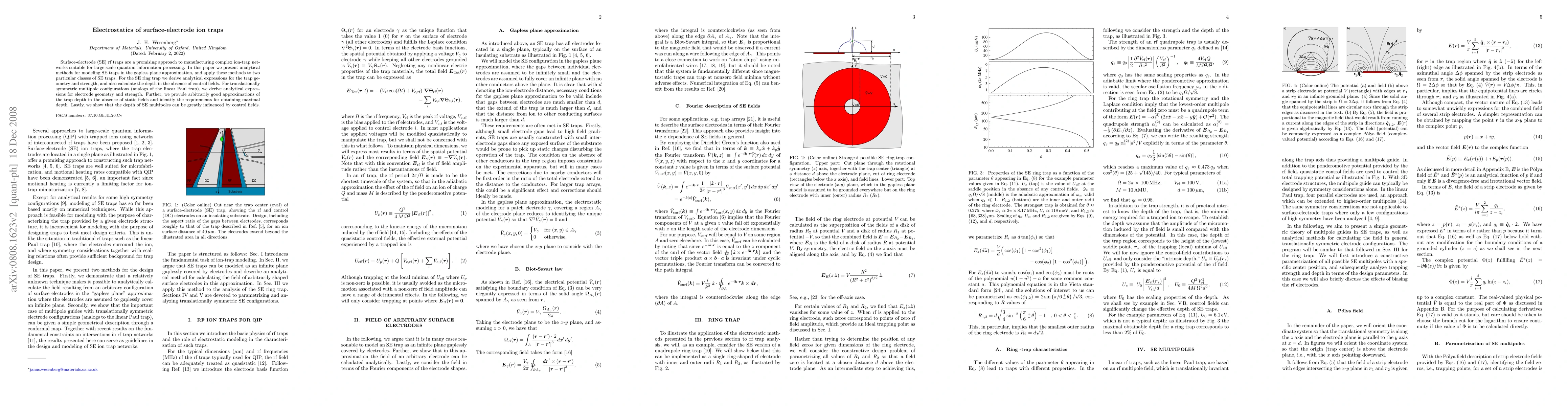 The paper presents analytical methods for modeling surface-electrode (SE) ion traps in the gapless plane approximation, deriving expressions for trap geometry, strength, and depth for specific configurations like SE ring traps and translationally symmetric multipole configurations.