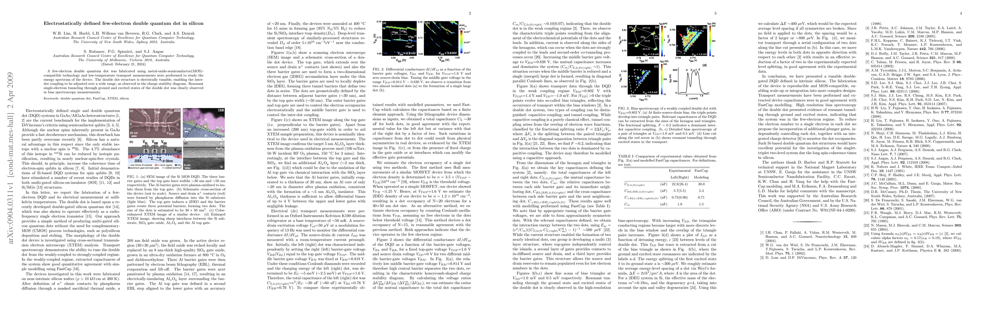 This paper presents a tunable few-electron double quantum dot fabricated using MOS technology, with low-temperature transport measurements revealing its adjustable inter-dot coupling and clear resonant tunneling through ground and excited states.