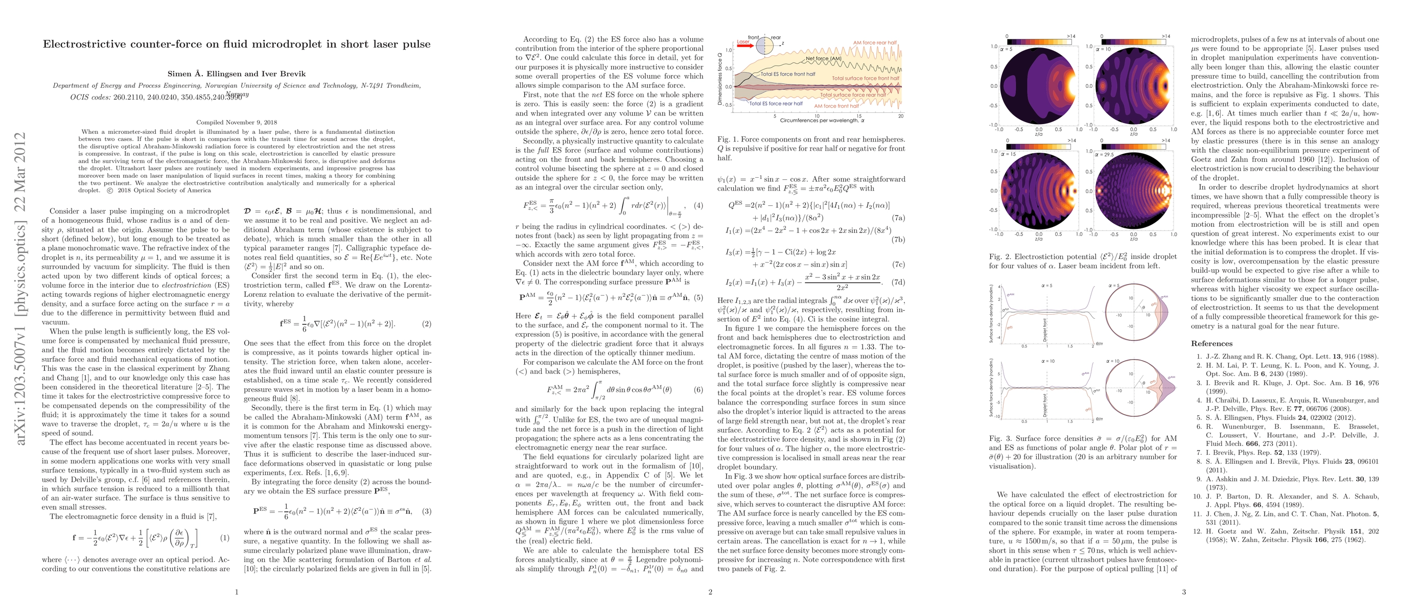 When a micrometer-sized fluid droplet is illuminated by a laser pulse, there is a fundamental distinction between two cases. If the pulse is short in comparison with the transit time for sound across the droplet, the disruptive optical Abraham-Minkowski radiation force is countered by electrostriction and the net stress is compressive. In contrast, if the pulse is long on this scale, electrostriction is cancelled by elastic pressure and the surviving term of the electromagnetic force, the Abraham-Minkowski force, is disruptive and deforms the droplet. Ultrashort laser pulses are routinely used in modern experiments, and impressive progress has moreover been made on laser manipulation of liquid surfaces in recent times, making a theory for combining the two pertinent. We analyze the electrostrictive contribution analytically and numerically for a spherical droplet.