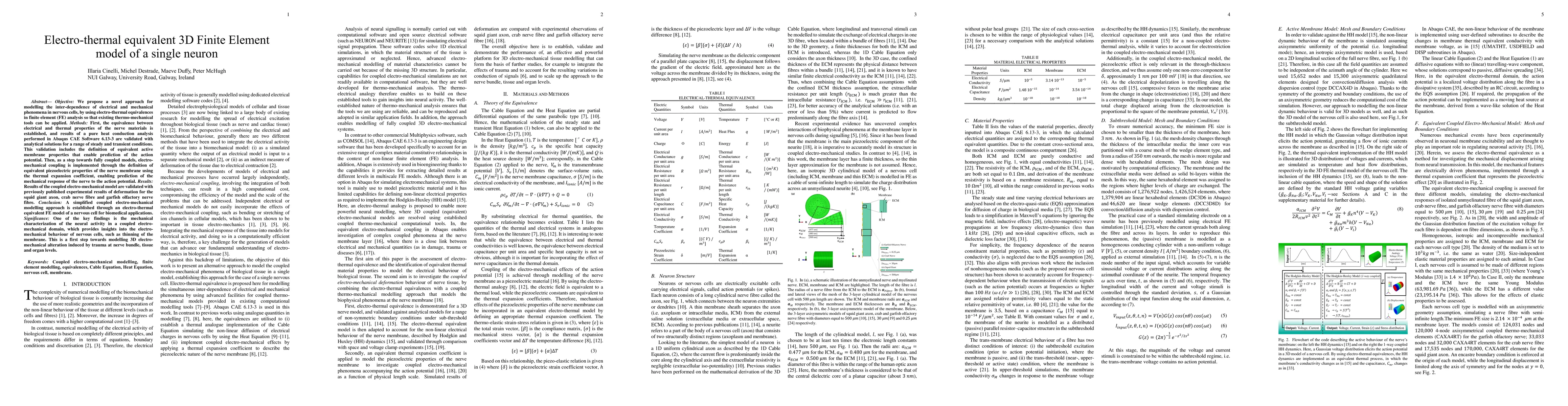 This paper proposes a novel electrothermal equivalent 3D Finite Element Model to simulate the interdependence of electrical and mechanical phenomena in neurons. The model uses electro-thermal equivalences to predict action potentials and mechanical responses, validated against experimental results, offering insights into the electromechanical behavior of nervous cells.