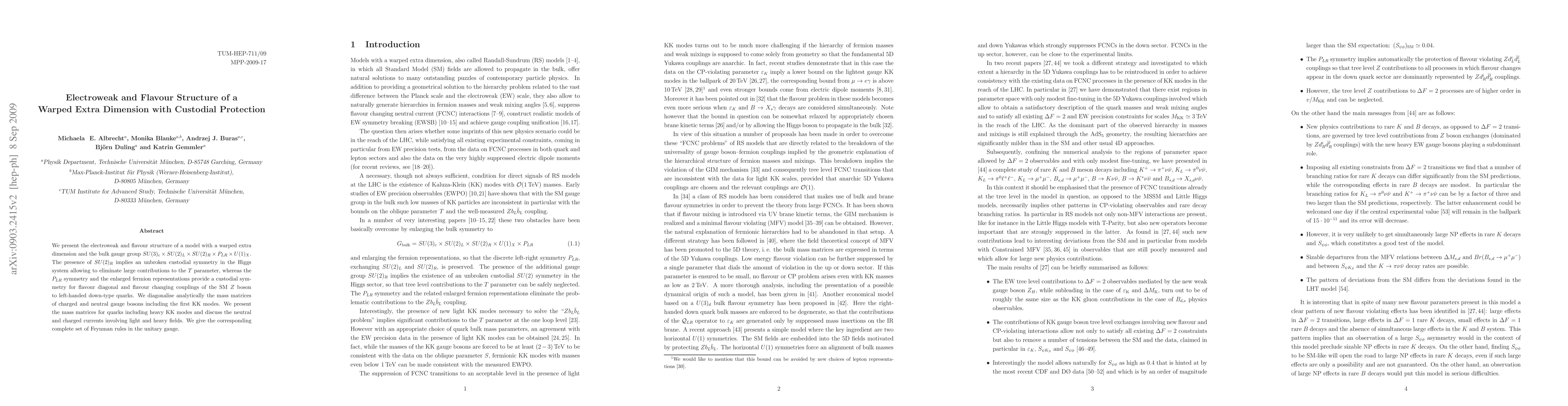 We present the electroweak and flavour structure of a model with a warped extra dimension and the bulk gauge group SU(3) x SU(2)_L x SU(2)_R x P_LR x U(1)_X. The presence of SU(2)_R implies an unbroken custodial symmetry in the Higgs system allowing to eliminate large contributions to the T parameter, whereas the P_LR symmetry and the enlarged fermion representations provide a custodial symmetry for flavour diagonal and flavour changing couplings of the SM Z boson to left-handed down-type quarks. We diagonalise analytically the mass matrices of charged and neutral gauge bosons including the first KK modes. We present the mass matrices for quarks including heavy KK modes and discuss the neutral and charged currents involving light and heavy fields. We give the corresponding complete set of Feynman rules in the unitary gauge.