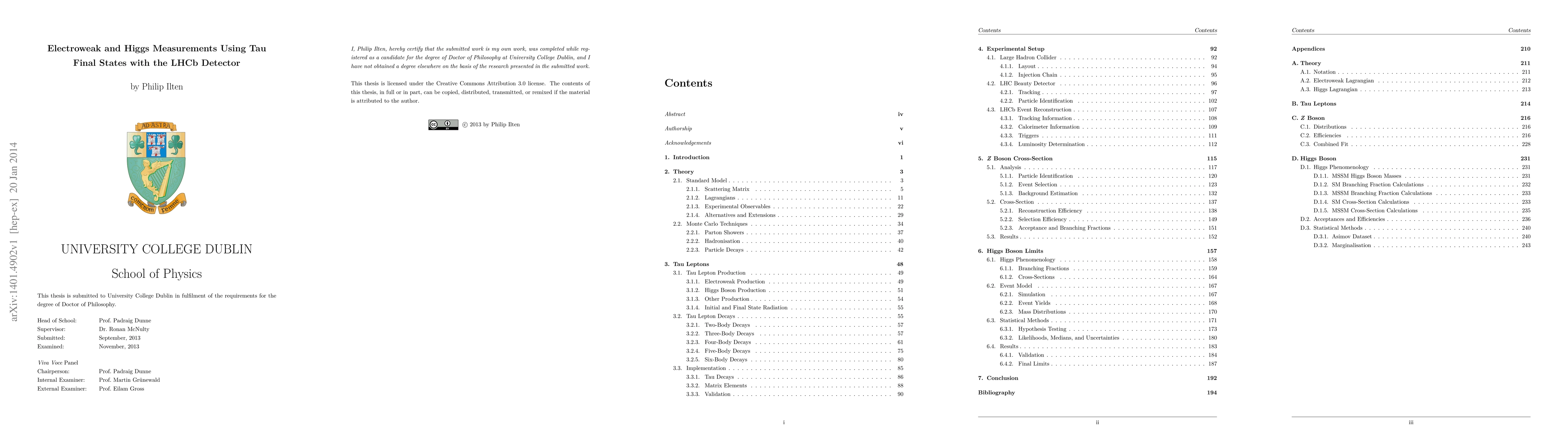 Spin correlations for tau lepton decays are included in the Pythia 8 event generation software and the spin correlations for the decays of tau leptons produced from electroweak and Higgs bosons are calculated. Decays of the tau lepton using sophisticated resonance models are included in Pythia 8 for all channels with experimentally observed branching fractions greater than 0.04%. The mass distributions for the decay products of these channels are validated and the technical implementation of these decays is described. A measurement of the inclusive Z to di-tau cross-section using 1.0 inverse fb of data from pp collisions at sqrt(s) = 7 TeV collected with the LHCb detector is presented. Reconstructed final states containing two muons, a muon and an electron, a muon and a charged hadron, or an electron and a charged hadron are selected as candidates. The cross-section for Z bosons with a mass between 60 and 120 GeV decaying into tau leptons with pseudo-rapidities between 2.0 and 4.5 and transverse momenta greater than 20 GeV is measured to be 72.3 +- 3.5 +- 2.9 +- 2.5 pb. The first uncertainty is statistical, the second uncertainty is systematic, and the third is to due the integrated luminosity uncertainty. Limits on the production of neutral Higgs bosons decaying into tau lepton pairs with pseudo-rapidities between 2.0 and 4.5 are set at a 95% confidence level using the same LHCb dataset. A model independent upper limit on the production of neutral Higgs bosons decaying into tau leptons is set and ranges between 8.6 pb for a Higgs boson mass of 90 GeV to 0.7 pb for a Higgs boson mass of 250 GeV. An upper limit on tan-beta in the CP-odd Higgs mass and tan-beta plane is set for the mh-max scenario of the minimal supersymmetric model and varies from 34 for a CP-odd Higgs boson mass of 90 GeV to 70 for a CP-odd Higgs boson mass of 140 GeV.