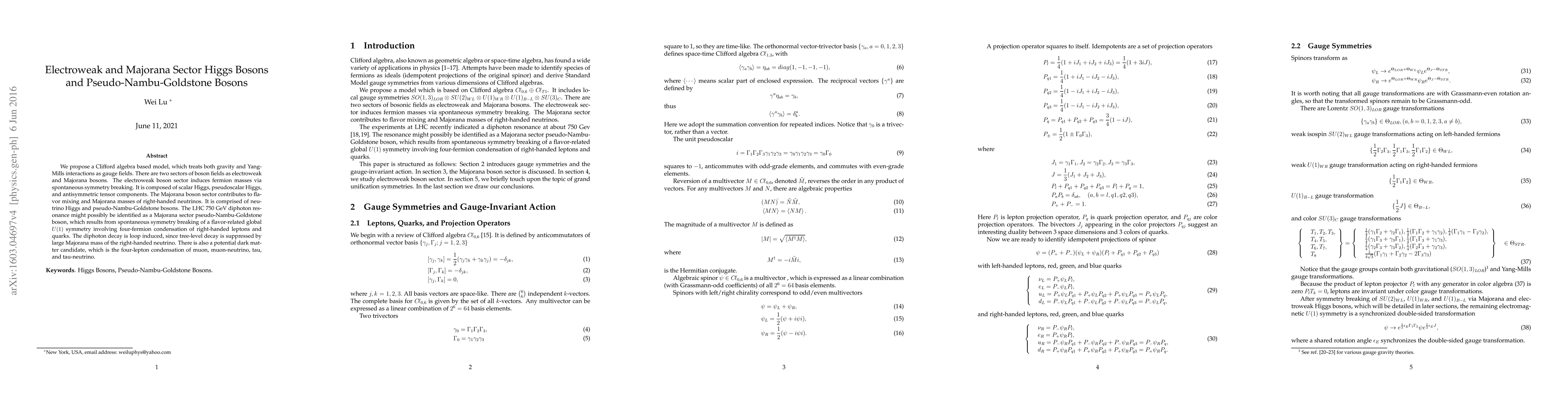 We propose a Clifford algebra based model, which treats both gravity and Yang-Mills interactions as gauge fields. There are two sectors of boson fields as electroweak and Majorana bosons. The electroweak boson sector induces fermion masses via spontaneous symmetry breaking. It is composed of scalar Higgs, pseudoscalar Higgs, and antisymmetric tensor components. The Majorana boson sector contributes to flavor mixing and Majorana masses of right-handed neutrinos. It is comprised of neutrino Higgs and pseudo-Nambu-Goldstone bosons. The LHC 750 GeV diphoton resonance might possibly be identified as a Majorana sector pseudo-Nambu-Goldstone boson, which results from spontaneous symmetry breaking of a flavor-related global U(1) symmetry involving four-fermion condensation of right-handed leptons and quarks. The diphoton decay is loop induced, since tree-level decay is suppressed by large Majorana mass of the right-handed neutrino. There is also a potential dark matter candidate, which is the four-lepton condensation of muon, muon-neutrino, tau, and tau-neutrino.